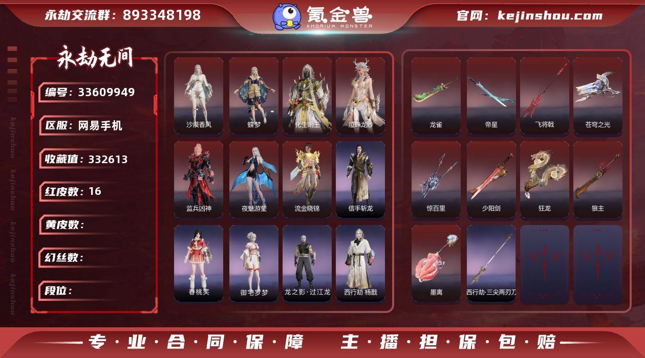 YJJ2365/5.12换绑/等级419/s20三人黄金4/16红509金收藏值332613/墨离/化生明王/蝶梦/泣珠龙纱/沙漠香风/监兵凶神/夜魅游莹/流金晓锦/苍穹之光/帝星/少阳剑/龙雀/狼主/飞将戟/狂龙/惊百里/璃光·星辉环月/西行劫·三尖两刃刀/绿野守护·竹韵悠/观山海·春木/信手斩龙/洛天依·星轨引航/春桃笑/御宅罗梦(白丝)/夏日派对·弄潮逐浪/西行劫·杨戬/龙之影·过江龙/西行劫·神君印/荆魂/拳皇·勾玉/幻丝229318/未绑定手游
