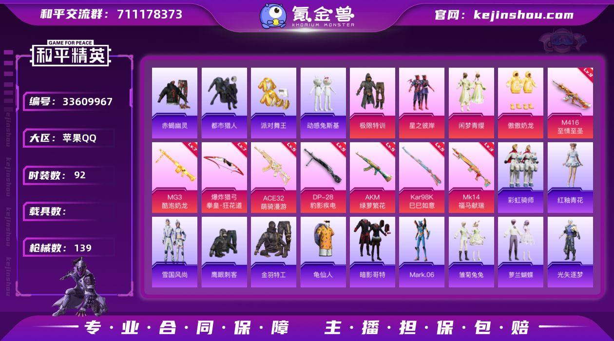 苹果 手Q-4粉装-8特效枪-0载具-2粉色飞行器-44834热力值-13王牌印记-92套装-139枪皮 【热门品类】:套装-赤蝎幽灵,套装-都市猎人,套装-派对舞王,套装-金羽特工,套装-动感兔斯基人偶服,套装-龟仙人,套装-暗影哥特,角色-Mark.06 【粉色套装】:粉装-极限特训,粉装-星之彼岸,粉装-闲梦青缨,粉装-傲傲奶龙 【粉色枪皮等级】:AKM-绿萝繁花(五级),M416-至情至圣(九级),ACE32-萌骑漫游(五级),Kar98K-巳巳如意(五级),Mk14-福马献瑞(三级),DP-28-豹影疾电(五级),MG3-酷泡奶龙(七级),爆炸猎弓-拳皇·狂花道(七级) 【粉色枪皮】:AKM-绿萝繁花,M416-至情至圣,ACE32-萌骑漫游,Kar98K-巳巳如意,Mk14-福马献瑞,DP-28-豹影疾电,MG3-酷泡奶龙,爆炸猎弓-拳皇·狂花道 【粉色飞行器】:炫彩糖果飞行器,云梦轻舟飞行器 【粉色降落伞】:极限特训降落伞,星之彼岸降落伞,闲梦青缨降落伞,炫光之旅降落伞,圣堂之誓降落伞,江南烟雨降落伞,精灵梦叶罗丽降落伞,初号机 觉醒Ver.降落伞,忍者神龟降落伞,圣域龙灵降落伞,炫彩糖果降落伞,霁蓝缠春降落伞 【稀有套装】:套装-龟仙人,套装-雪国风尚,套装-炫彩糖果,套装-彩虹骑师,套装-雏菊兔兔,套装-萝兰蝴蝶,角色-光...