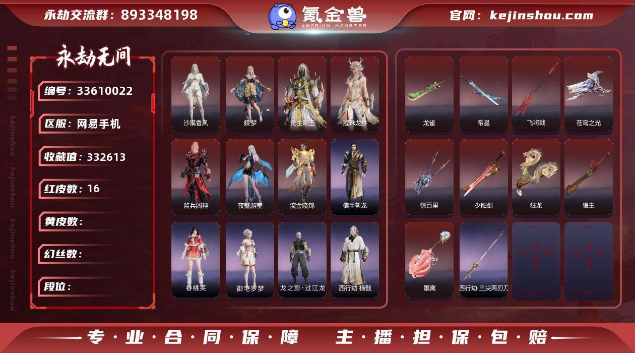 YJJ2365/5.12换绑/等级419/s20三人黄金4/16红509金收藏值332613/墨离/化生明王/蝶梦/泣珠龙纱/沙漠香风/监兵凶神/夜魅游莹/流金晓锦/苍穹之光/帝星/少阳剑/龙雀/狼主/飞将戟/狂龙/惊百里/璃光·星辉环月/西行劫·三尖两刃刀/绿野守护·竹韵悠/观山海·春木/信手斩龙/洛天依·星轨引航/春桃笑/御宅罗梦(白丝)/夏日派对·弄潮逐浪/西行劫·杨戬/龙之影·过江龙/西行劫·神君印/荆魂/拳皇·勾玉/幻丝229318/未绑定手游