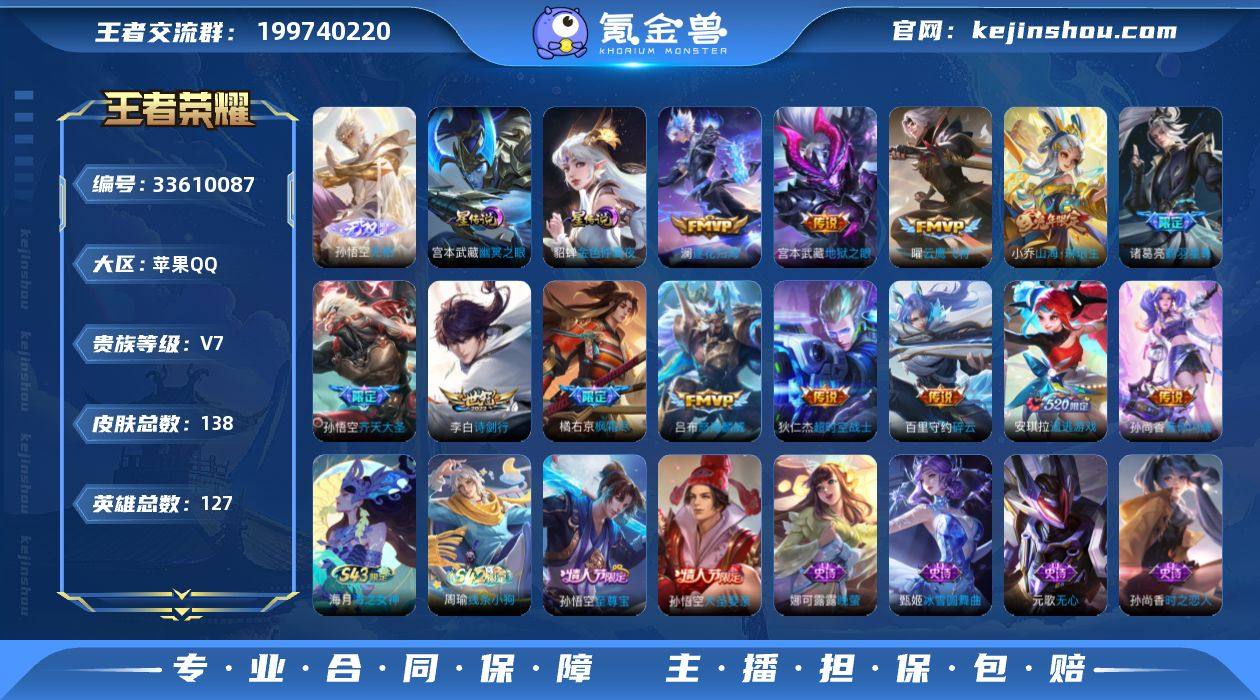 苹果Q-V7-永恒钻石V段位-127英雄-138皮肤-1无双-13传说-23史诗 【无双皮肤】:孙悟空无相 【传说皮肤】:澜逐花归海,诸葛亮鹤羽星尊,安琪拉追逃游戏,孙悟空齐天大圣,小乔山海琳琅生,吕布怒海麟威,李白诗剑行,百里守约碎云,橘右京枫霜尽,孙尚香音你闪耀,曜云鹰飞将,宫本武藏地狱之眼,狄仁杰超时空战士 【限定皮肤】:白起狰,狄仁杰阴阳师,虞姬凯尔特女王,小乔山海琳琅生,赵云皇家上将,阿轲迷踪丽影,钟无艳超时空战士,扁鹊奇幻香踪,吕布猎兽之王,元歌无心,夏侯惇朔风刀,甄姬落雪兰心,典韦穷奇,狄仁杰魔术师,狄仁杰万华元夜,项羽海滩派对,老夫子醍醐杖,安琪拉追逃游戏,程咬金演武夺筹,橘右京枫霜尽,孙悟空至尊宝,孙悟空大圣娶亲,孙悟空齐天大圣,牛魔御旌,李元芳云中旅人,钟馗驱傩正仪,杨戬潮玩骑兵,太乙真人饕餮,鬼谷子原初探秘者,鬼谷子五谷丰年,诸葛亮鹤羽星尊,弈星混沌棋,明世隐疑决卦,裴擒虎擒涛扼浪,狂铁御狮,米莱狄御霄,盾山御銮,鲁班大师探海日志,桑启海盐诗旅,艾琳女武神,张良古海寻踪,鬼谷子天穹祈灯,刘邦剑破天穹 【年限皮肤】:小乔山海琳琅生 【赛季限定】:虞姬凯尔特女王,白起狰,太乙真人饕餮,典韦穷奇...
