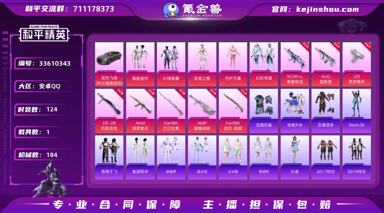 无二次安卓 手Q-5粉装-8特效枪-1载具-1粉色飞行器-58124热力值-6王牌印记-124套装-184枪皮TD2641707 【热门品类】:套装-浪漫天命,套装-忍者信条,角色-Mark.06 【粉色套装】:粉装-智能音符,粉装-幻情紫藤,角色-圣堂之誓,角色-守护天翼,粉装-幻彩电音 【粉色枪皮等级】:AKM-绿萝繁花(五级),SCAR-L-青春物语(七级),AUG-超新星(七级),UZI-筑梦精灵(七级),Kar98K-创世·救赎(三级),Kar98K-巳巳如意(五级),AMR-智耀战神(四级),DP-28-豹影疾电(五级) 【粉色载具】:宾利飞驰(布罗德盖棕双色) 【粉色枪皮】:AKM-绿萝繁花,SCAR-L-青春物语,AUG-超新星,UZI-筑梦精灵,Kar98K-创世·救赎,Kar98K-巳巳如意,AMR-智耀战神,DP-28-豹影疾电 【粉色飞行器】:炫彩糖果飞行器 【粉色降落伞】:橘柚倾心降落伞,音爆索尼克降落伞,飒粉甜心降落伞,炫光之旅降落伞,精灵梦叶罗丽降落伞,创世·救赎降落伞,金丰海韵降落伞,智耀战神降落伞,炫彩糖果降落伞 【稀有套装】:套装-炫彩糖果,套装-燕燕于飞,套装-鱼渊荷华,套装-紫幽梦,套装-蓝冰羽,套装-云朵鹅,套装-雪绒豹,角色-乐音 【稀有枪皮】:AKM-彩虹符号,AKM-海渊国主,AKM-灼热熔岩,AKM-破晓战魂,AKM-缤纷海...