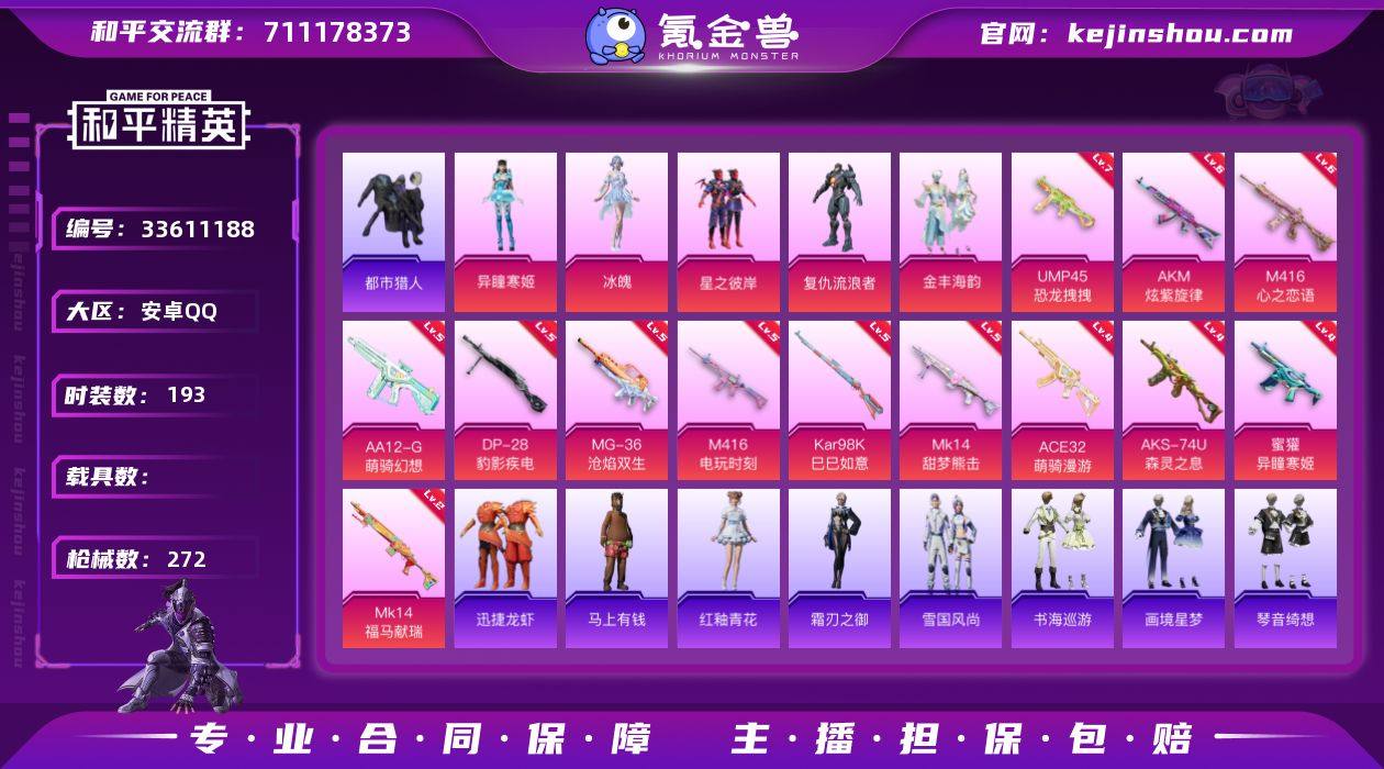 【kyhp1605】安卓 手Q-5粉装-13特效枪-0载具-3粉色飞行器-79951热力值-20王牌印记-193套装-272枪皮 【热门品类】:套装-都市猎人,套装-小丑鱼,套装-粉红小猪 【粉色套装】:粉装-星之彼岸,角色-复仇流浪者,粉装-金丰海韵,角色-冰魄,角色-异瞳寒姬 【粉色枪皮等级】:AKM-炫紫旋律(六级),M416-心之恋语(六级),M416-电玩时刻(五级),蜜獾-异瞳寒姬(四级),ACE32-萌骑漫游(四级),UMP45-恐龙拽拽(七级),AKS-74U-森灵之息(四级),Kar98K-巳巳如意(五级),Mk14-甜梦熊击(五级),Mk14-福马献瑞(二级),AA12-G-萌骑幻想(五级),DP-28-豹影疾电(五级),MG-36-沧焰双生(五级) 【粉色枪皮】:AKM-炫紫旋律,M416-心之恋语,M416-电玩时刻,蜜獾-异瞳寒姬,ACE32-萌骑漫游,UMP45-恐龙拽拽,AKS-74U-森灵之息,Kar98K-巳巳如意,Mk14-甜梦熊击,Mk14-福马献瑞,AA12-G-萌骑幻想,DP-28-豹影疾电,MG-36-沧焰双生 【粉色飞行器】:炫彩糖果飞行器,梦幻火箭飞行器,极意拳锋飞行器 【粉色降落伞】:星之彼岸降落伞,甜心娃娃降落伞,碧影闪光降落伞,环太平洋降落伞,垂柳戏鸭降落伞,炫光之旅降落伞,精灵梦叶罗丽降落伞,智耀战神降落伞,异瞳寒姬降落伞,炫彩糖果降落伞 【稀...