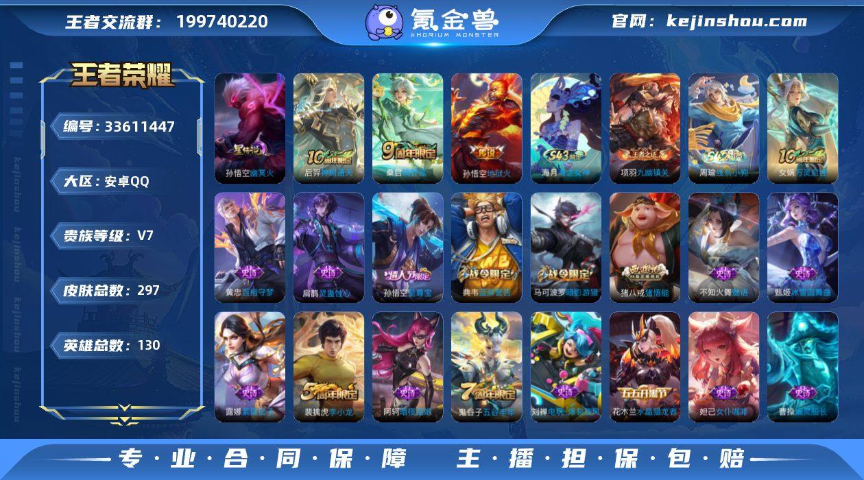 安卓Q-V7-永恒钻石II段位-130英雄-297皮肤-1典藏英雄-3传说-69史诗 【英雄全皮】:猪八戒全皮 【荣耀典藏】:武则天英雄 【传说皮肤】:后羿神树通天,桑启鸣野蒿,孙悟空地狱火 【限定皮肤】:白起狰,蔡文姬夏日便利店,虞姬夏日便利店,姜子牙天穹之誓,狄仁杰阴阳师,虞姬凯尔特女王,赵云皇家上将,墨子神迹守卫,嬴政优雅恋人,嬴政白昼王子,孙尚香蔷薇恋人,鲁班七号狮舞东方,庄周蜃楼王,庄周高山流水,阿轲迷踪丽影,孙膑妖精王,扁鹊炼金王,白起夜都怪侠,芈月重明,芈月幻夜卜梦,吕布猎兽之王,周瑜赤莲之焰,夏侯惇朔风刀,甄姬游园惊梦,曹操烛龙,典韦穷奇,典韦蓝屏警告,马可波罗暗影游猎,狄仁杰魔术师,狄仁杰万华元夜,达摩沙漠行僧,项羽海滩派对,老夫子醍醐杖,老夫子航海奇遇记,程咬金演武夺筹,刘邦夺宝奇兵,兰陵王金庭之子,亚瑟潮玩骑士王,孙悟空至尊宝,牛魔御旌,后羿圣弓游侠,李元芳银河之约,李元芳云中旅人,钟馗神迹守卫,钟馗驱傩正仪,女娲朔望之晖,干将莫邪真爱魔法,雅典娜单词大作战,雅典娜黎明之约,太乙真人饕餮,鬼谷子原初探秘者,鬼谷子五谷丰年,黄忠火炮绅士,苏烈千军破阵,百里玄策原初追逐者,弈星混沌棋,沈梦溪星...