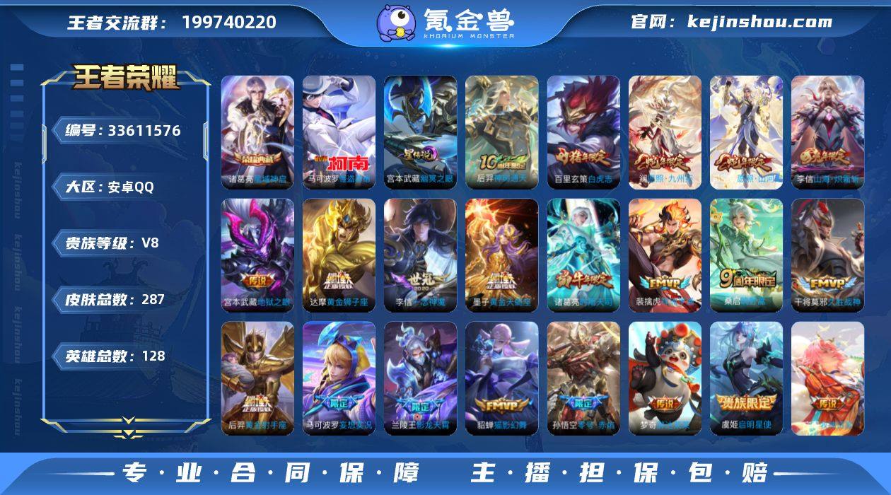 安卓Q-V8-至尊星耀V段位-127英雄-287皮肤-1典藏皮肤-1珍品传说-21传说-78史诗 【荣耀典藏】:诸葛亮星域神启 【珍品传说】:马可波罗怪盗基德 【传说皮肤】:后羿神树通天,司空震愿照山河定,澜愿照九州拓,裴擒虎祥瑞亨通,桑启鸣野蒿,庄周牧神诗旅,墨子黄金天蝎座,兰陵王影龙天霄,马可波罗妄想实况,李信山海炽霜斩,诸葛亮时雨天司,虞姬启明星使,孙悟空零号赤焰,李信一念神魔,貂蝉猫影幻舞,干将莫邪久胜战神,达摩黄金狮子座,百里玄策白虎志,梦奇胖达荣荣,后羿黄金射手座,宫本武藏地狱之眼 【限定皮肤】:白起狰,暃埋骨钱,大乔绒语心约,姜子牙天穹之誓,杨戬破阵退雄兵,李白谪仙醉月,狄仁杰阴阳师,虞姬凯尔特女王,赵云皇家上将,赵云龙胆,嬴政优雅恋人,嬴政白昼王子,孙尚香蔷薇恋人,鲁班七号狮舞东方,阿轲迷踪丽影,吕布猎兽之王,元歌云间偶戏,夏侯惇朔风刀,典韦穷奇,马可波罗暗影游猎,马可波罗山海玄木吟,马可波罗妄想实况,狄仁杰魔术师,狄仁杰万华元夜,达摩沙漠行僧,项羽海滩派对,老夫子醍醐杖,程咬金演武夺筹,刘邦夺宝奇兵,韩信飞衡,韩信傲雪梅枪,兰陵王影龙天霄,亚瑟潮玩骑士王,孙悟空至尊宝,孙悟空零号赤焰,牛魔御旌,...