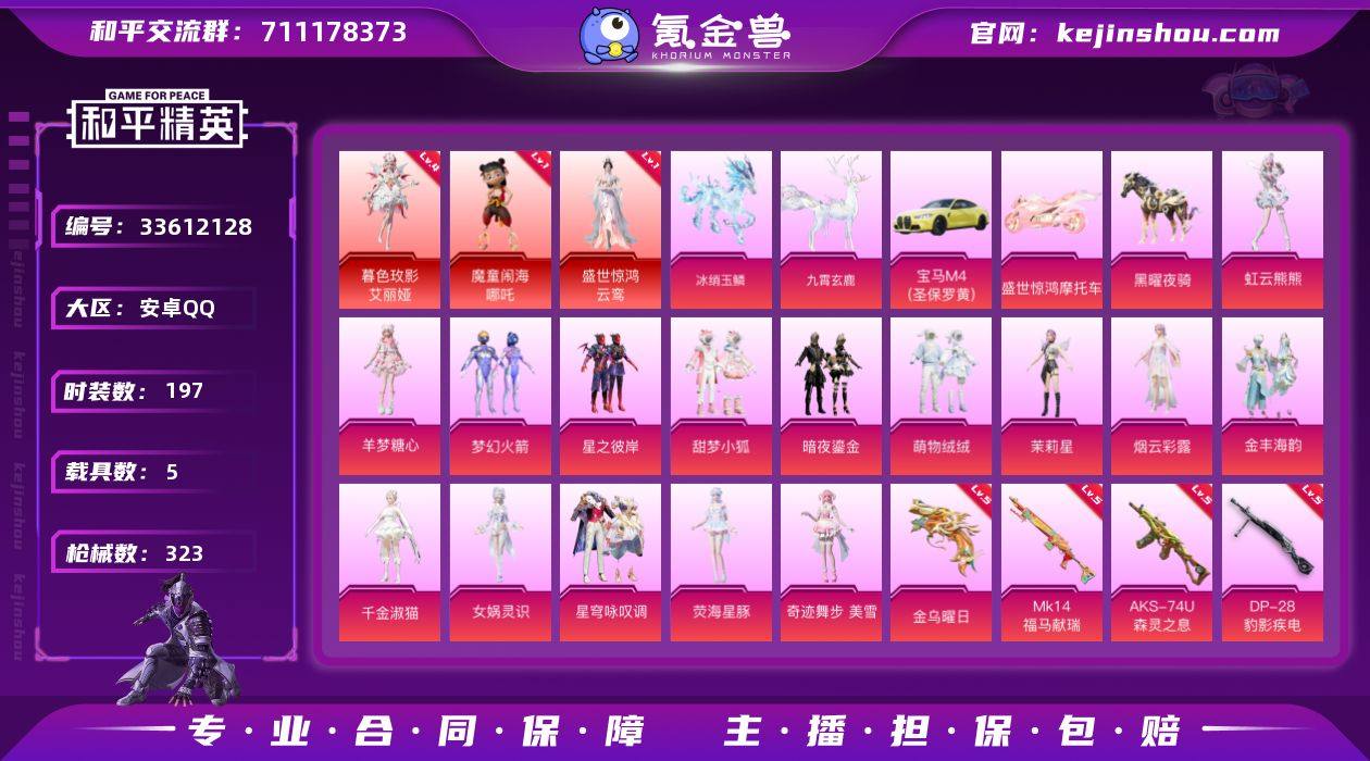 【kyhp1632】安卓 手Q-3神装-15粉装-23特效枪-5载具-13粉色飞行器-115957热力值-18王牌印记-197套装-323枪皮 【红色神装等级】:暮色玫影-艾丽娅(四级),魔童闹海-哪吒(一级),盛世惊鸿-云鸾(一级) 【红色角色神装】:暮色玫影-艾丽娅,魔童闹海-哪吒,盛世惊鸿-云鸾 【热门品类】:粉装-梦幻火箭,套装-龟仙人 【粉色套装】:粉装-梦幻火箭,粉装-星之彼岸,粉装-甜梦小狐,粉装-暗夜鎏金,粉装-萌物绒绒,角色-茉莉星,角色-烟云彩露,粉装-金丰海韵,角色-千金淑猫,角色-女娲灵识,粉装-星穹咏叹调,角色-荧海星豚,角色-奇迹舞步 美雪,角色-羊梦糖心,角色-虹云熊熊 【粉色枪皮等级】:AKM-绿萝繁花(五级),AKM-暮色玫影(三级),SCAR-L-青春物语(三级),SCAR-L-魔童闹海 哪吒(三级),M416-心之恋语(五级),M416-风花雪月(四级),M416-灵猫魔法师(三级),GROZA-镜光银凌(五级),AUG-暖羊咩咩(五级),M762-青锋波束(五级),M762-鬼刀(二级),UMP45-萌骑冒险(二级),AKS-74U-森灵之息(五级),Kar98K-巳巳如意(五级),Kar98K-圣域龙灵(三级),Mk14-盛世惊鸿(三级),Mk14-福马献瑞(五级),M249-绝对恒星(四级),DP-28-暗夜鎏金(五级),DP-28-豹影疾电(五级),MG-36-沧焰双生(...