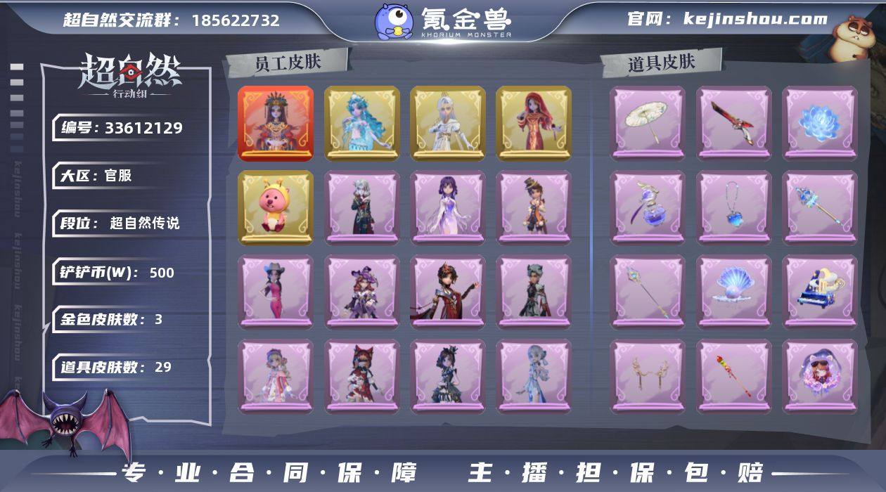 ZRX1014,红皮:1,金皮:3,紫皮:11,道具皮:29,外观:巫铃儿-镜生遗梦,逍遥-剑仙,巫铃儿-镜花辞,薇薇安-海月息潮,艾伦-黎明猎手,爱丽丝-耀眼的你,小黄-异色序曲,爱德华-梵卓之礼,莉莉-莓果陷阱,薇薇安-仙锋小姐,巫铃儿-素影瑶光,爱丽丝-甜梦派对,兰-千夜星谕,巫铃儿-琢玉怀乡,阿念-庆宴绮愿,道具:长枪-波塞冬,葫芦-海心凝珠,腰包-私藏的银河,桃木剑-凤鸣九天,黄牛能量饮料-珍珠芭乐莓莓,夜视仪-敛花容,黄牛能量饮料-无人岸,传送按钮-昆仑镜,腰包-惊魂娃娃,闪光弹-金戈玄铜,折扇-露露扇,电击枪-权杖的许诺,除颤仪-冰晶般的代价,音响-happy猫,腰包-红运福虎,长鞭-缚誓之锁,黄牛能量饮料-青玉抱丹,音响-月光奏鸣曲,黄牛能量饮料-雪顶奇愿,长枪-罪棘,伞-郁金春信,葫芦-伏妖塔,夜视仪-金丝眼镜,短管猎枪-安魂曲,长枪-糖葫芦霸王枪,额外的背包-飞花令,摸金符-海洋之心,急救包-蔷薇物语,铲子-龙鳞,饰品:头饰-芝麻糊汤圆,头饰-萨卡班甲鱼头套,头饰-烛光纪念,头饰-蒜了八,头饰-面具马头套,头饰-鱼头怪头套,头饰-饺饺者头套,头饰-煤球喵头套,头饰-卑微头套,头饰-烈焰红唇头套,头饰-马上有钱,头饰-滑稽头套,头饰-腊肠扭扭,头饰-嘻嘻头套,头饰-樱桃奶油布丁,头饰-哈士奇头套,头饰-呆滞头套,头饰...