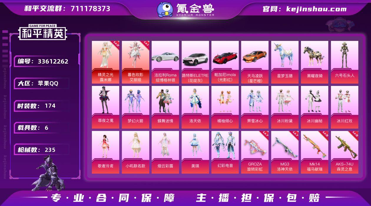 【Hhp259】【精品女号】:苹果Q区-可二次-连体王者带馥梦繁花-V9-女号-340皮肤-2典藏皮肤-1典藏英雄-1珍品无双-2珍品传说-28传说-99史诗--【2神装 6载具 10特效枪 16粉装 174套装 235枪皮 19粉色飞行器】-优质装备:暮色玫影-艾丽娅(一级)、精灵之光-露米娜(二级)、粉装-梦幻火箭、角色-洛天依、法拉利Roma(纽博格林银)、路特斯ELETRE(花绽灰)、帕加尼imola(光影红)、天马凌跃(星芒橙)、星梦玉骢、黑曜夜骑 【红色神装等级】:暮色玫影-艾丽娅(一级),精灵之光-露米娜(二级) 【红色角色神装】:暮色玫影-艾丽娅,精灵之光-露米娜 【热门品类】:粉装-梦幻火箭,套装-龟仙人,套装-糯粉咩咩,角色-8号机,角色-Mark.06 【粉色套装】:粉装-蝶舞迷情,粉装-梦幻火箭,角色-洛天依,粉装-橘柚倾心,粉装-霁雪冰心,粉装-冰川粉黛,粉装-冰川幽秘,粉装-冰川红玫,角色-歌者泠鸢,角色-小叽联名款,角色-烟云彩露,角色-美琪,粉装-幻彩电音,角色-罪夜之冕,粉装-光之祷告,角色-六号石头人 【粉色枪皮等级】:AKM-暮色玫影(三级),SCAR-L-锦绣绵绵(五级),M416-灵猫魔法师(三级),GROZA-旋转彩虹(七级),Vector-最终圣卫者(三级),AKS-74U-森灵之息(五级),Kar98K-巳巳...