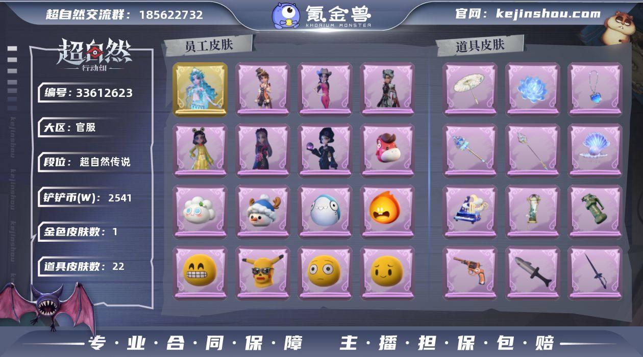 ZRX1019,红皮:0,粉皮:0,金皮:1,紫皮:6,道具皮:22,外观:薇薇安-海月息潮,爱丽丝-丝缕哀歌,薇薇安-黑月挽歌,阿念-庆宴绮愿,爱丽丝-耀眼的你,艾伦-黎明猎手,小黄-呱呱雨衣,道具:长鞭-缚誓之锁,除颤仪-冰晶般的代价,腰包-宝剑八,转轮手枪-新星时代,短管猎枪-赞萌露比水枪,传送按钮-浮生一梦,夜视仪-金丝眼镜,急救包-蔷薇物语,闪光弹-金戈玄铜,摸金符-花落精绝,长枪-波塞冬,伞-郁金春信,刺刀-小鲨匕首,喷气背包-乘风溯雪,电击枪-权杖的许诺,桃木剑-永眠曲,音响-鸣沙鼓,摸金符-海洋之心,葫芦-海心凝珠,音响-月光奏鸣曲,长鞭-新春炸响,腰包-红运福虎,美妆:美妆-萌兔气泡,美妆-暗夜小恶魔,饰品:头饰-炙热烧烤,头饰-萨卡班甲鱼头套,头饰-滑稽头套,头饰-腊肠扭扭,头饰-火爆了头套,头饰-樱桃奶油布丁,头饰-蒜了八,头饰-哈士奇头套,头饰-咬咬鲨头套,头饰-惊魂南瓜头套,头饰-烈焰红唇头套,头饰-太空鲨头套,头饰-面具马头套,头饰-雪墩墩头套,头饰-芝麻糊汤圆,头饰-呆滞头套,头饰-卑微头套,头饰-马上有钱,头饰-大葱明头套,头饰-烛光纪念,头饰-嘻嘻头套,头饰-驼半仙头套,头饰-饺饺者头套,头饰-鱼头怪头套,头饰-像素朋克墨镜,头饰-粽小宝头套,头饰-后室幸存者头套,挂饰-孤独对望,挂饰-小小玛丽,...