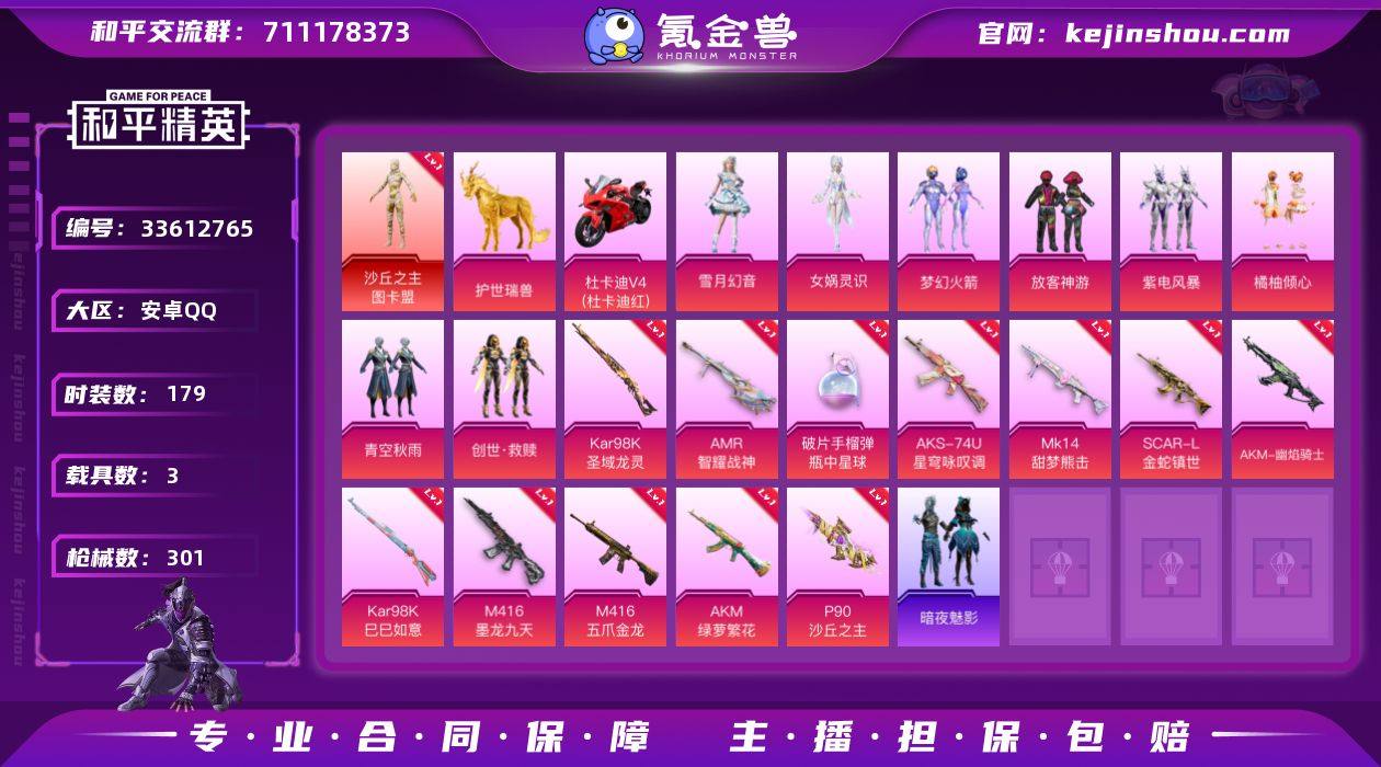 1红装 10粉装 14粉枪 3载具 179套装 301枪皮 护世瑞兽 杜卡迪 Panigale V4(杜卡迪红) 沙丘之主-图卡盟 放客神游 梦幻火箭 橘柚倾心 滨海厨神 吉莉礼服 虎虎生威吉莉 幻影公爵 疯狂小兔子 极速竞梦 白熊同盟 炫蓝之夏 猎梦纪元 牛气满满 猛禽 潮流游乐家 破晓战魂 电音精灵 荷畔雨呱 星夜迷魅 飞行日记 暗夜魅影 福星高照 遗落祭司 浑天鲲鹏 柠萌假日 王牌教练 雪兔飞飞 飞驰魅影 音速流光 空岛之星 贵族骑装 金戈铁马 惊鸿侠骨 萌趣咩咩 竞技名士 娇憨猪猪 锦衣飞扬 深蓝色名流 蓝调潮人 晨曦薄雾 绝对偶像 酸甜橘柚 深海梦境 龙的传人 玉兔迎春 快闪甜心 忠义严颜 特战装甲 田园牧歌 春光漫游 轻风白浪 湖蓝色名流 光之冒险 绯格组合 滨海假日 街头潮人 怒火燎原 蓝彩潮人 绮丽涂鸦 旭日情侣 浓情蜜辣 缤纷果语 暗金炫舞 格斗先锋 幻世战舞者 麻辣教官 金耀舞者 幻影武者 摩艾涂鸦 冰川特警 夏日音浪 探宝勇士 紫电风暴 青空秋雨 创世·救赎 雪月幻音 角色-女娲灵识 M416-墨龙九天(3级) Kar98K-圣域龙灵(3级) SCAR-L-金蛇镇世(3级) AKM-幽焰骑士(3级) P90-沙丘之主(3级) M416-五爪金龙(7级) S686-生命誓言 汤姆逊-奇异狩猎者 汤姆逊-银刃赛罗 SCAR-L-黄金龙骨 G36C-镜域双华...