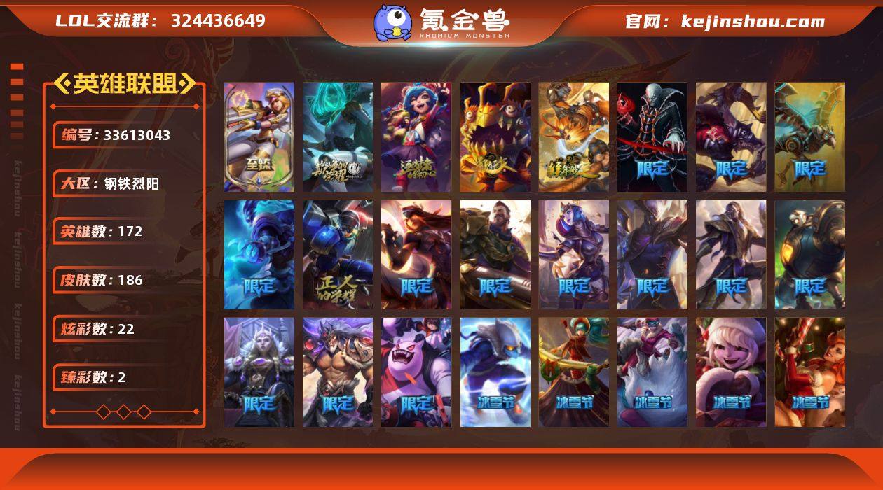 未定级段位-172英雄-186皮肤-22炫彩-0终极-3神话-27限定-22传说-46史诗 【热门头像】:卡特琳娜的匕首头像 【神话皮肤】:十周年纪念安妮,源代码乐芙兰 【至臻皮肤】:至臻电玩女神凯特琳 【臻彩皮肤】:无畏骑士瑟庄妮赤子初心,冠军典狱长锤石凯旋圣装 【年限皮肤】:醒狮克格莫,美猴王孙悟空 【冰雪限定】:圣诞精灵崔丝塔娜,圣诞糖果棒厄运小姐,阿木木“主人不要我了”,平安夜女神娑娜,圣诞玩偶波比,圣诞老人古拉加斯,魄罗骑士瑟庄妮,冰雪节玛尔扎哈 【限定皮肤】:诺斯费拉图弗拉基米尔,冠军典狱长锤石,暗杀星努努和威朗普,胜利女神希维尔,胜利枪神格雷福斯,胜利女神奥莉安娜,胜利之剑亚托克斯,胜利枪神卢锡安,胜利机器人布里茨,胜利女神瑟庄妮,胜利之王泰达米尔,南瓜头费德提克,鬼影森森茂凯,都铎王朝图奇,钢铁之翼艾尼维亚,防暴天使凯尔 【传说皮肤】:铁哥们儿奥拉夫,地狱之门卫士加里奥,大天使长米迦勒凯尔,恶魔男爵瑞兹,西部天使艾希,恶魔之刃泰达米尔,鬼魂新娘莫甘娜,绅士科加斯,双重冰晶艾尼维亚,律政大亨蒙多,红色男爵库奇,最终BOSS维迦,陆地王者4WD布里茨,苹果机器人布里茨,上古战魂魔腾,神拳李青,银河魔装机神兰博,死...