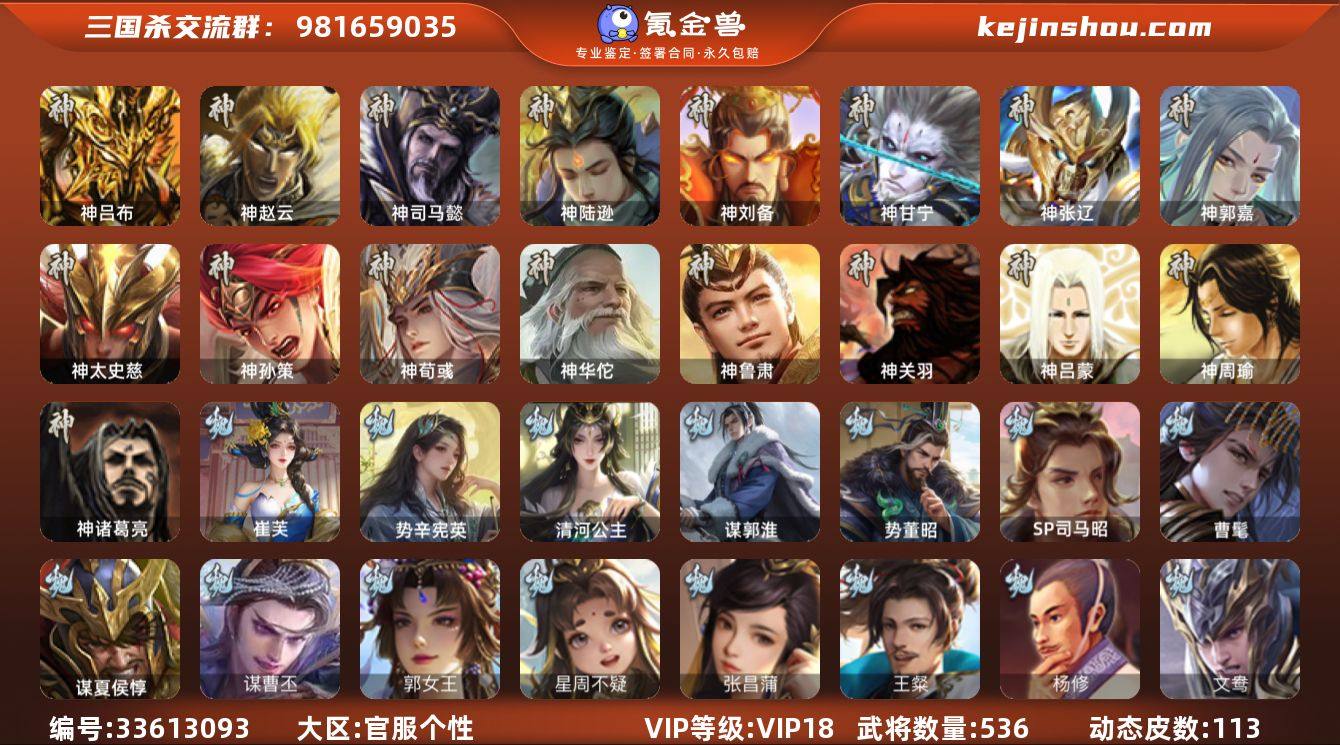 官阶:大将军;VIP等级:VIP18;史诗武将数量:120;动态皮肤数量:113;武将总数:536;史诗宝珠数量:18;将魂数量:21511;神将:14;魏国史诗武将:56;蜀国史诗武将:22;吴国史诗武将:20;群史诗武将:40 神吕布,神赵云,神司马懿,神陆逊,神刘备,神甘宁,神张辽,神郭嘉,神太史慈,神孙策,神荀彧,神华佗,神诸葛亮,神鲁肃,SP司马昭,曹髦,郭女王,星周不疑,张昌蒲,王粲,杨修,王元姬,王凌,王朗,马钧,界钟会,界于禁,界曹真,嵇康,郝昭,陈琳,曹婴,曹纯,戏志才,刘晔,谋夏侯惇,谋曹丕,势董昭,清河公主,崔芙,势辛宪英,程昱,关索,谋诸葛亮,谋刘备,马云騄,谋黄忠,谋夏侯氏,谋赵云,谋马超,诸葛瞻,周群,赵襄,张星彩,王平,沙摩柯,谯周,傅佥,界黄忠,花鬘,董允,鲍三娘,谋关羽,势魏延,张奋,谋陆逊,谋黄盖,谋孙策,周处,吴景,孙皓,孙寒华,骆统,留赞,界朱然,界徐盛,界步练师,贺齐,势陆郁生,势太史慈,文鸯,谋孙尚香,谋公孙瓒,十常侍,裴秀,界沮授,皇甫嵩,左慈,郑玄,张仲景,张让,张琪瑛,杨彪,徐荣,星黄忠,星甘宁,陶谦,苏飞,司马徽,审配,麹义,南华老仙,祢衡,刘璋,刘焉,沮授,界左慈,界李儒,公孙康,杜预,卑弥呼,许攸,谋吕布,势于吉,友诸葛亮,星董卓,笮融,兀突骨,士燮,司马昭,谋郭淮,神吕蒙,神周瑜,神关羽,势夏侯尚,...