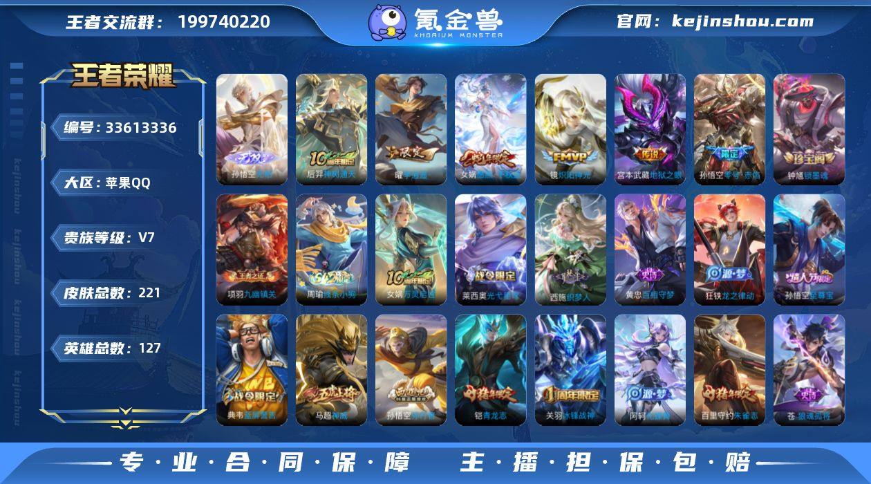 【221皮肤1无双6传说 孙悟空无相 女娲愿照千秋盛 曜李逍遥 孙悟空零号赤焰】苹果Q-V7-至尊星耀III段位-127英雄-221皮肤-1无双-6传说-66史诗 【英雄全皮】:苍全皮 【无双皮肤】:孙悟空无相 【传说皮肤】:后羿神树通天,女娲愿照千秋盛,曜李逍遥 ,镜炽阳神光,孙悟空零号赤焰,宫本武藏地狱之眼 【限定皮肤】:狄仁杰阴阳师,赵云皇家上将,孙尚香蔷薇恋人,庄周高山流水,高渐离玩趣恶龙,钟无艳超时空战士,白起夜都怪侠,芈月幻夜卜梦,吕布猎兽之王,元歌无心,甄姬落雪兰心,典韦蓝屏警告,狄仁杰魔术师,达摩沙漠行僧,项羽海滩派对,关羽冰锋战神,程咬金演武夺筹,韩信逐梦之影,王昭君午后时光,兰陵王金庭之子,花木兰瑞麟志,孙悟空至尊宝,孙悟空零号赤焰,孙悟空孙行者,后羿圣弓游侠,李元芳云中旅人,钟馗驱傩正仪,干将莫邪真爱魔法,鬼谷子五谷丰年,黄忠火炮绅士,铠青龙志,苏烈千军破阵,百里守约朱雀志,梦奇顽趣,沈梦溪大漠名商,明世隐吟游魔法,裴擒虎李小龙,裴擒虎擒涛扼浪,狂铁电玩高手,云中君纤云弄巧,伽罗天狼溯光者,猪八戒猪悟能,嫦娥拒霜思,曜李逍遥 ,鲁班大师探海日志,桑启海盐诗旅,阿古朵江河有灵,张良古海寻踪,蒙犽百解令,...