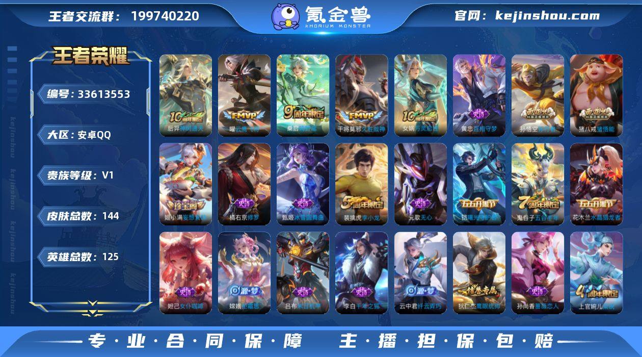安卓Q-V0-最强王者段位-125英雄-144皮肤-4传说-41史诗 【英雄全皮】:猪八戒全皮 【传说皮肤】:后羿神树通天,桑启鸣野蒿,曜云鹰飞将,干将莫邪久胜战神 【限定皮肤】:狄仁杰阴阳师,孙尚香蔷薇恋人,庄周高山流水,高渐离玩趣恶龙,元歌无心,狄仁杰万华元夜,达摩沙漠行僧,项羽海滩派对,老夫子醍醐杖,程咬金演武夺筹,兰陵王金庭之子,孙悟空孙行者,李元芳云中旅人,钟馗驱傩正仪,鬼谷子原初探秘者,鬼谷子五谷丰年,苏烈千军破阵,沈梦溪大漠名商,裴擒虎李小龙,裴擒虎擒涛扼浪,云中君纤云弄巧,猪八戒西部大镖客,猪八戒猪悟能,上官婉儿梁祝,嫦娥拒霜思,鲁班大师探海日志,桑启海盐诗旅,阿古朵江河有灵,张良古海寻踪,蒙犽百解令,鬼谷子天穹祈灯,姬小满妄想食味,沈梦溪龙舞盛年,程咬金群星魔术团,周瑜熔金海岸 【赛季限定】:老夫子醍醐杖,鬼谷子原初探秘者,狄仁杰万华元夜,程咬金演武夺筹,钟馗驱傩正仪,苏烈千军破阵,达摩沙漠行僧,兰陵王金庭之子,沈梦溪大漠名商,李元芳云中旅人,桑启海盐诗旅,裴擒虎擒涛扼浪,鲁班大师探海日志,张良古海寻踪,鬼谷子天穹祈灯,钟馗虚灵犬护,甄姬逆浪荇歌,亚瑟荣光之誓 【战令限定】:猪八戒西部大镖...