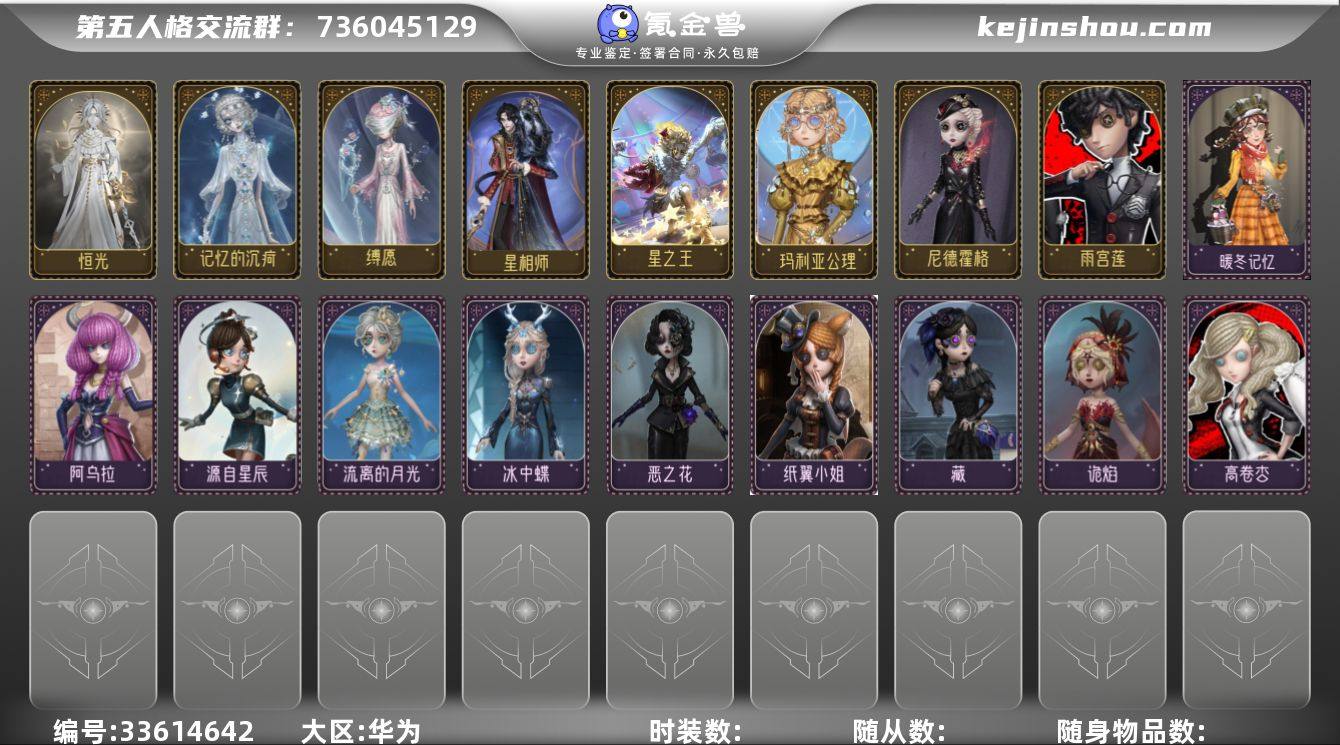 摄影师-“恒光”,昆虫学者-缚愿,“女王蜂”-记忆的沉疴,蜡像师-星相师,“喧嚣”-星之王,盲女-玛利亚公理,空军-尼德霍格,杂技演员-雨宫莲 卖家说:雨宫莲+2限定+1深渊