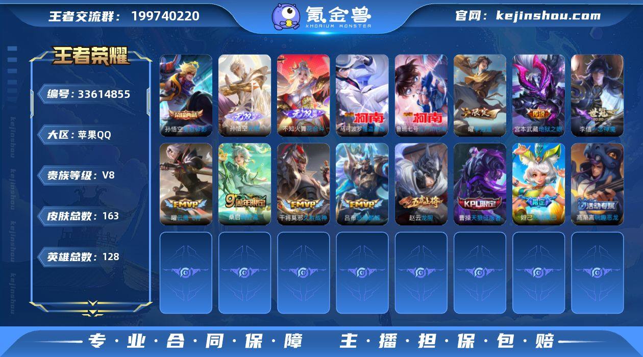 苹果Q 不可二次 1典藏3无双4珍品16传说 1星传 幽冥之眼 128英雄163皮肤 全息碎影 无相 器灵螭龙剑 花合斗 兔狲蓬尾 时之奇旅孙策 江户川柯南 怪盗基德 愿照岁时盈 愿照千秋盛 愿照众生和 愿照九州拓 愿照山河定 愿照福禄聚 鸣野蒿 启明星使 山海琳琅生 李逍遥 怒海麟威 云鹰飞将 久胜战神 一念神魔 地狱之眼 末日机甲女 万灵启世 龙胆 逐霄之志 天狼征服者 热情桑巴 原初追逐者 灵蛊蚀心 藏狐褐绒 天秀启明 滕王阁序 无限星赏官 水晶猎龙者 暗隐猎兽者 猫狗日记男 金属风暴 黄金分割率 玩趣恶龙 逐浪之夏 修罗 晚萤 千年之狐 紫霞仙子 功夫厨神 心灵骇客 圣诞恋歌 幽灵船长 乘风破浪 圣诞狂欢 星夜王子 节奏热浪 天才门将 偶像歌手 街头霸王 箭羽风息 摇滚巨星 缤纷独角兽 鬼剑武藏 德古拉伯爵 拳王 大漠名商 敏锐之力 云中旅人 丁香结 海盐诗旅 皇家上将 擒涛扼浪 魅力维加斯 探海日志 水果甜心 无心 鹰眼统帅 魔术师 顽趣梦奇 王者荣耀账号