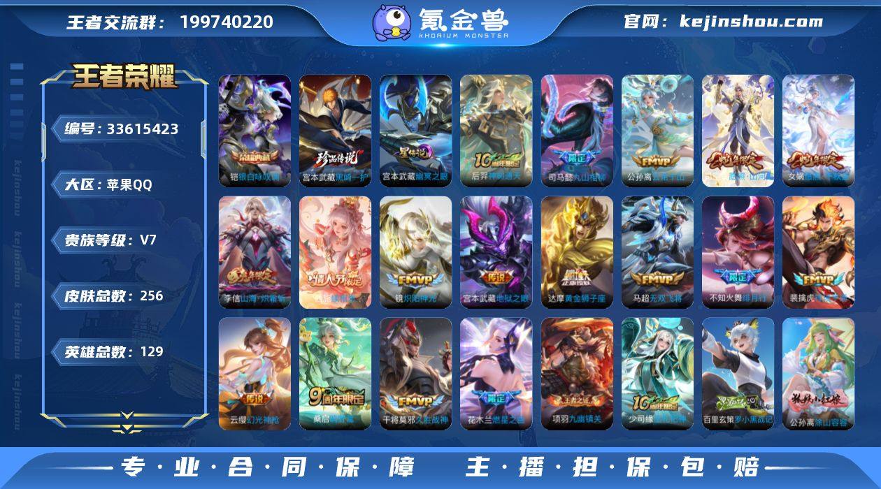 V7 1小国标 1典藏 1珍品 17传说 1星元 256皮肤 129英雄 【1水晶】铠-银白咏叹调【1珍品传说】宫本武藏-黑崎一护【17传说】李信-山海·炽霜斩,不知火舞-绯月行,马超-无双飞将,达摩-黄金狮子座,干将莫邪-久胜战神,宫本武藏-地狱之眼,镜-炽阳神光,花木兰-燃星之曲,桑启-鸣野蒿,云缨-幻光神枪,裴擒虎-祥瑞亨通,司空震-愿照·山河定,女娲-愿照·千秋盛,西施-续相思,公孙离-云诺千山,司马懿-九山相柳,后羿-神树通天【1星元】宫本武藏-幽冥之眼【57史诗】上官婉儿-神器·万象笔,赵云-未来纪元,高渐离-天秀·音浪,澜-赏金猎手,阿轲-节奏热浪,白起-星夜王子,百里守约-特工魅影,曹操-幽灵船长,嫦娥-拒霜思,程咬金-功夫厨神,妲己-魅力维加斯,狄仁杰-魔术师,狄仁杰-鹰眼统帅,貂蝉-圣诞恋歌,宫本武藏-鬼剑武藏,花木兰-水晶猎龙者,铠-曙光守护者,兰陵王-暗隐猎兽者,李元芳-逐浪之夏,刘邦-德古拉伯爵,刘禅-绅士熊喵,刘禅-天才门将,露娜-紫霞仙子,吕布-圣诞狂欢,墨子-金属风暴,上官婉儿-梁祝,司马懿-暗渊魔法,孙尚香-水果甜心,孙尚香-时之恋人,王昭君-偶像歌手,夏侯惇-乘风破浪,小乔-青蛇,雅典娜-黎明之约,亚瑟-心灵战警,嬴政-摇滚巨星,云中君-纤云弄巧,赵云-皇家上将,甄姬-冰雪圆舞曲,甄姬-游园惊...