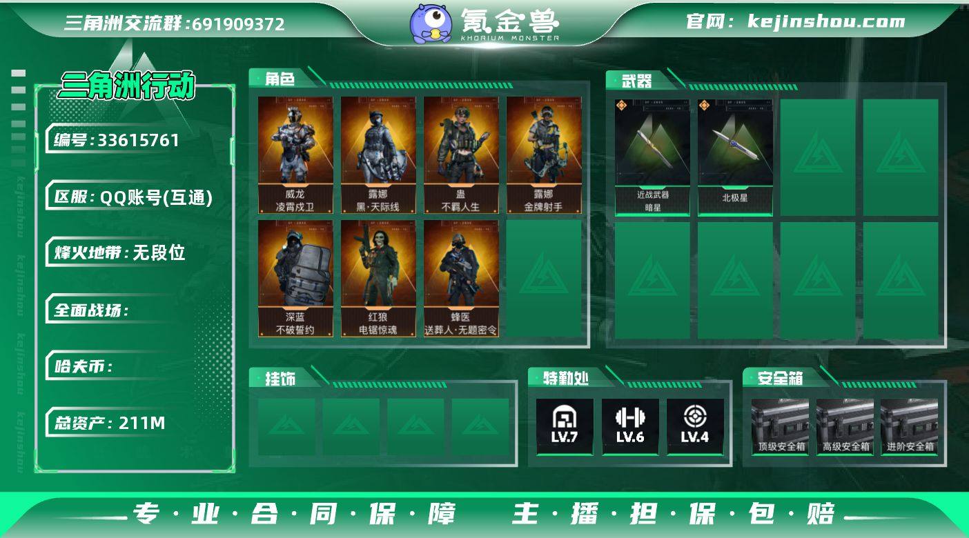 211m总资产【干员外观】:电锯惊魂,威龙凌霄戍卫,蜂医送葬人无题密令,深蓝不破誓约,露娜黑·天际线,露娜金牌射手,蛊-不羁人生【近战皮肤】:北极星,暗星