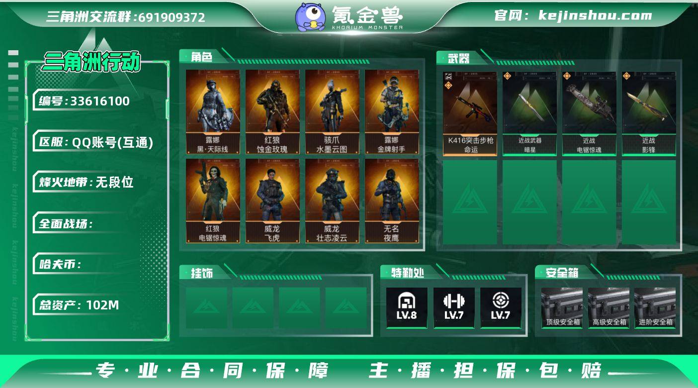 102m总资产【干员外观】:红狼蚀金玫瑰,电锯惊魂,威龙飞虎,威龙壮志凌云,无名夜鹰,露娜黑·天际线,露娜金牌射手,骇爪水墨云图【近战皮肤】:暗星,影锋,电锯惊魂【典藏1件】:K416命运