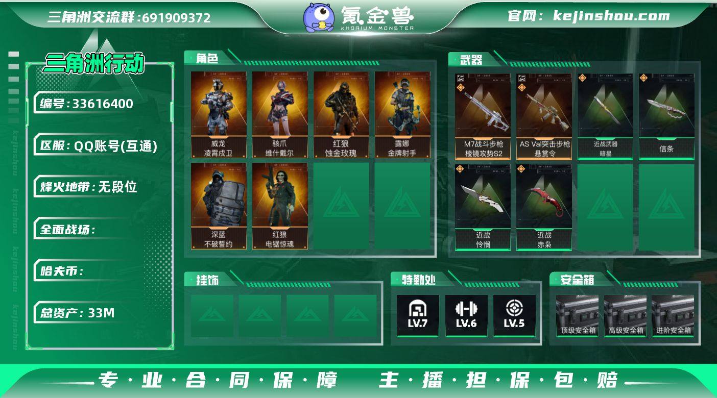 33m总资产【干员外观】:红狼蚀金玫瑰,电锯惊魂,威龙凌霄戍卫,深蓝不破誓约,露娜金牌射手,骇爪维什戴尔【近战皮肤】:赤枭,怜悯,信条,暗星【典藏2件】:M7棱镜S2,ASVal悬赏令
