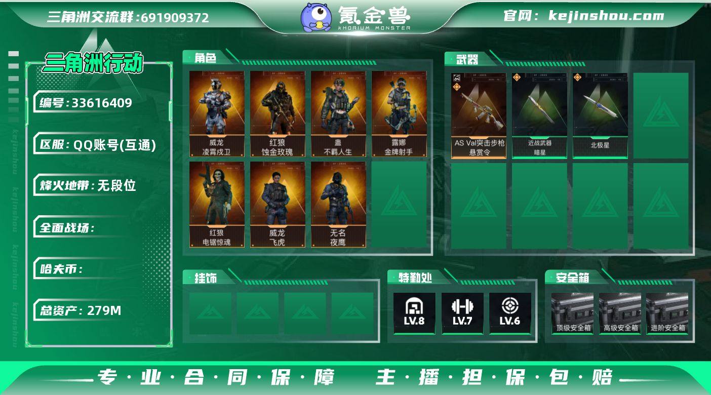 279m总资产【干员外观】:红狼蚀金玫瑰,威龙凌霄戍卫,威龙飞虎,电锯惊魂,蛊-不羁人生,无名夜鹰,露娜金牌射手【近战皮肤】:北极星,暗星【典藏1件】:ASVal悬赏令