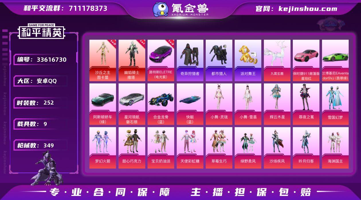 【LHPX1384】连体王者v9/安卓 手Q-2神装-24粉装-32特效枪-9载具-10粉色飞行器-143196热力值-21王牌印记-252套装-349枪皮 【红色载具】:路特斯ELETRE(电光紫)(三级) 【红色神装等级】:幽焰骑士-维塔(一级),沙丘之主-图卡盟(二级) 【红色角色神装】:幽焰骑士-维塔,沙丘之主-图卡盟 【热门品类】:粉装-雪国幻梦,粉装-梦幻火箭,套装-浪漫天命,套装-都市猎人,套装-派对舞王,套装-奇异狩猎者,角色-军刀雅典娜,套装-龟仙人,套装-暗影哥特 【粉色套装】:粉装-甜心巧克力,粉装-宝贝奶油派,粉装-天使彩虹糖,粉装-雪国幻梦,粉装-梦幻火箭,粉装-草莓生巧,粉装-绿野柔风,粉装-沙场疾风,粉装-吟月归客,粉装-海渊国主,角色-2号机款机体服,粉装-暗星紫秘,粉装-海盐物语,角色-复仇流浪者,粉装-垂柳戏鸭,粉装-彩虹甜喵,蜀山剑侠-李逍遥,女娲后裔-赵灵儿,粉装-第五大道,角色-萨利娅,角色-罪夜之冕,角色-辉云木星,人物-小舞·灵珑,人物-小舞·雪昙 【粉色枪皮等级】:AKM-甜心宝贝(六级),AKM-炫紫旋律(二级),AKM-幽焰骑士(三级),AKM-暮色玫影(一级),SCAR-L-梦幻火箭(六级),M416-五爪金龙(一级),M416-心之恋语(五级),GROZA-香水柠檬(五级),M762-激战...