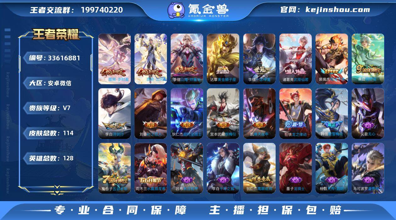 AL702461 【退游急出老号贵7,司空震愿照山河定,虞姬愿照岁时盈,裴擒虎祥瑞亨通,宫本武藏惊梅引,李白诗剑行,刘备时之恋人,桑启鸣野蒿,李信山海炽霜斩,狄仁杰超时空战士,诸葛亮武陵仙君,铠绛天战甲,达摩黄金狮子座,李信一念神魔 个性按键4个】 皮肤数114 传说皮肤数13 史诗皮肤数29 英雄数128 营地id1756122714 贵族等级【文本】贵族7级 【贵族7级】 内测皮肤1 年限皮肤3 限定皮肤32 赛季限定11 史诗皮肤29 战令限定4 勇者皮肤51 其他皮肤21 内测皮肤:高渐离玩趣恶龙; 年限皮肤:司空震愿照山河定,虞姬愿照岁时盈,李信山海炽霜斩; 限定皮肤:狂铁龙之律动,阿古朵布丁狗之约,司空震愿照山河定,虞姬愿照岁时盈,吕布逐霄战戟,桑启鸣野蒿,高渐离玩趣恶龙,姜子牙天穹之誓,鬼谷子天穹祈灯,鲁班大师探海日志,裴擒虎擒涛扼浪,雅典娜黎明之约,李信山海炽霜斩,桑启海盐诗旅,元歌无心,鬼谷子五谷丰年,李元芳云中旅人,狄仁杰鹰眼统帅,狄仁杰阴阳师,沈梦溪大漠名商,明世隐吟游魔法,白起夜都怪侠,诸葛亮武陵仙君,兰陵王金庭之子,黄忠火炮绅士,芈月幻夜卜梦,达摩沙漠行僧,韩信傲雪梅枪,狄仁杰魔术师,赵云皇家上将,苏烈千军破阵,项羽海滩派对...