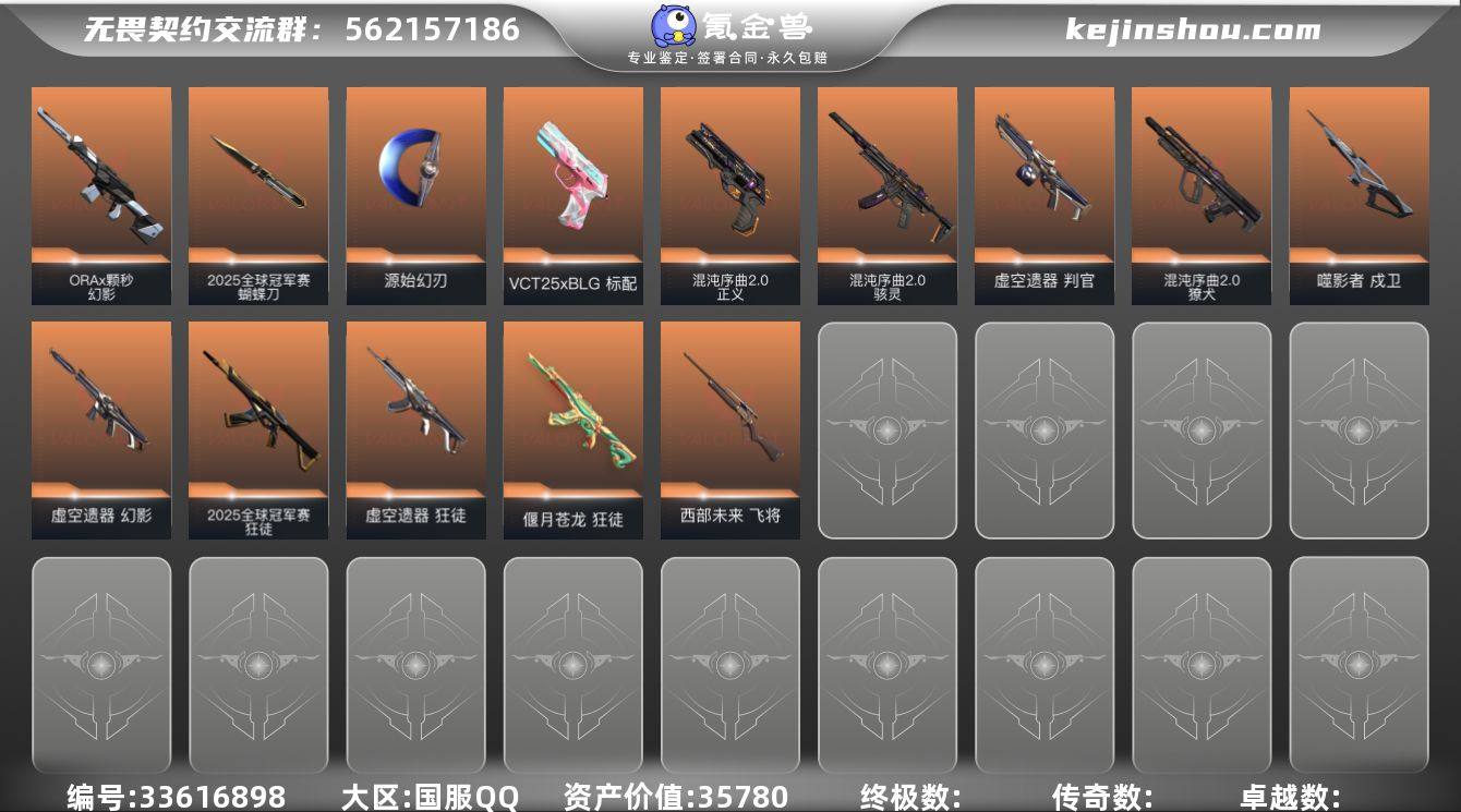 MWW652[总资产35780 25冠军套 虚空套 西部飞将 VCTBLG 22冠军 源始幻刃]【游戏等级】Lv147 【段位】 黄金III 【R点】800 【皮肤总价值】35,780 【英雄数量】29 【皮肤数量】50 【挂饰数量】69 【卡面数量】107 【喷漆数量】77 【戍卫】戍卫-掠影 戍卫-噬影者 【幻影】幻影-ORAx颗秒 幻影-虚空遗器 【飞将】飞将-西部未来 【骇灵】骇灵-混沌序曲//2.0 【正义】正义-混沌序曲//2.0 正义-虚空遗器 【獠犬】獠犬-混沌序曲//2.0 【标配】标配-VCT25xBLG 【狂徒】狂徒-2025全球冠军赛 狂徒-偃月苍龙 狂徒-虚空遗器 【近战武器】近战武器-2025全球冠军赛蝴蝶刀 近战武器-2022全球冠军赛蝴蝶刀 近战武器-源始幻刃 【莽侠】莽侠-神中神罚 【冥驹】冥驹-掠影 【判官】判官-虚空遗器