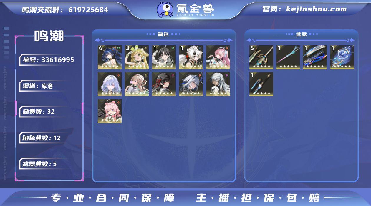 男/女主: 男主 总黄数: 32 联觉等级: 68 拥有五星共鸣者: 鉴心,卡卡罗,安可,维里奈,凌阳,尤诺,嘉贝莉娜,千咲,琳奈,莫宁,爱弥斯 6鸣五星共鸣者: 6鸣尤诺 3鸣五星共鸣者: 3鸣维里奈 1鸣五星共鸣者: 1鸣鉴心,1鸣凌阳 0鸣五星共鸣者: 0鸣卡卡罗,0鸣安可,0鸣嘉贝莉娜,0鸣千咲,0鸣琳奈,0鸣莫宁,0鸣爱弥斯 拥有五星武器: 千古洑流,血誓盟约,万物持存的注释,光影双生,永远的启明星 5鸣五星武器: 5鸣血誓盟约 1鸣五星武器: 1鸣千古洑流,1鸣万物持存的注释,1鸣光影双生,1鸣永远的启明星 亮点: 【MC351】68级/32黄/男主/12个五星角色/5个五星武器未绑定,爱弥斯,西格莉卡,尤诺,嘉贝莉娜,千咲,琳奈,莫宁,维里奈,卡卡罗,鉴心,安可,凌阳,永远的启明星,光影双生,万物持存的注释,血誓盟约,千古洑流,满命尤诺,3命维里奈,1命鉴心,1命凌阳,0命爱弥斯,0命西格莉卡,0命嘉贝莉娜,0命千咲,0命琳奈,0命莫宁,0命卡卡罗,0命安可,精5血誓盟约,精1永远的启明星,精1光影双生,精1万物持存的注释,精1千古洑流