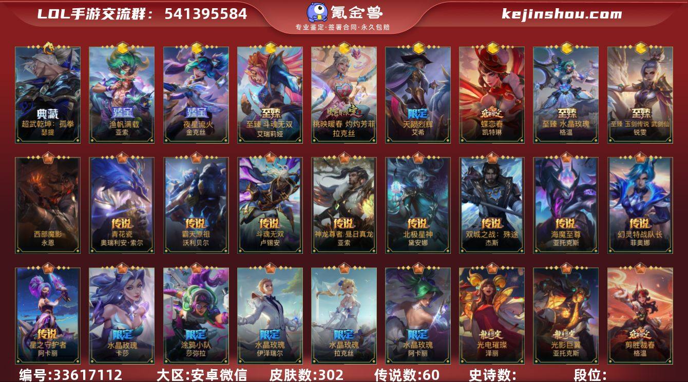 实名: 可修改 皮肤数: 302 典藏皮: 超武乾坤:孤拳 神话皮: 蝶恋春女警,至臻锐雯,至臻水晶格温,天陨烈辉 艾希,桃映暖春 灼灼芳菲 拉克丝,至臻 斗魂无双 艾瑞莉娅,夜星流火 金克丝,渔帆满载 亚索 限定皮肤: 水晶玫瑰拉克丝,水晶玫瑰伊泽瑞尔,水晶玫瑰阿卡丽,涂鸦小队莎弥拉,吕布奉先,赵云子龙,掠星魔刃,斩星魔剑,养蜂人,烈焰美人薇恩,神龙烈焰金克丝 传说皮: 福牛守护者女枪,灌篮高手,光明哨兵薇恩,黑夜使者亚索,黎明使者锐雯,炼狱魔犬,欧米伽小队 幽灵特工,日蚀骑士蕾欧娜,水晶玫瑰阿卡丽,神拳盲僧,神王诺手,水晶玫瑰拉克丝,水晶玫瑰EZ,天煞劫,西部魔影卢锡安,西部天使寒冰,西部天使赛娜,星域游侠卡牌,星之守护者阿狸,星之守护者 落,驯龙炮手,源计划:净化,源计划:联合,月蚀骑士蕾欧娜,战斗学院ez,灵魂莲华锤石,涂鸦小队莎弥拉,剪胜裁春格温,黎明使者永恩,源计划:林,源计划:泯灭,暗星女王拉克丝,最终BOSS维迦,跳跳倩影女枪,斗魂无双亚索,星域武神贾克斯,星之守护者卡莎,灵魂莲华阿狸,灵魂莲华腕豪,心之钢凯隐,魔女伊芙琳,光影巨翼亚托克斯,光电璀璨泽丽,战斗学院女警,斗魂觉醒 莎弥拉,神龙尊者 圣龙 李青,水晶玫瑰 卡莎,星之守护者 阿卡丽,幻灵特战队长 菲奥娜,海魔至尊 亚...