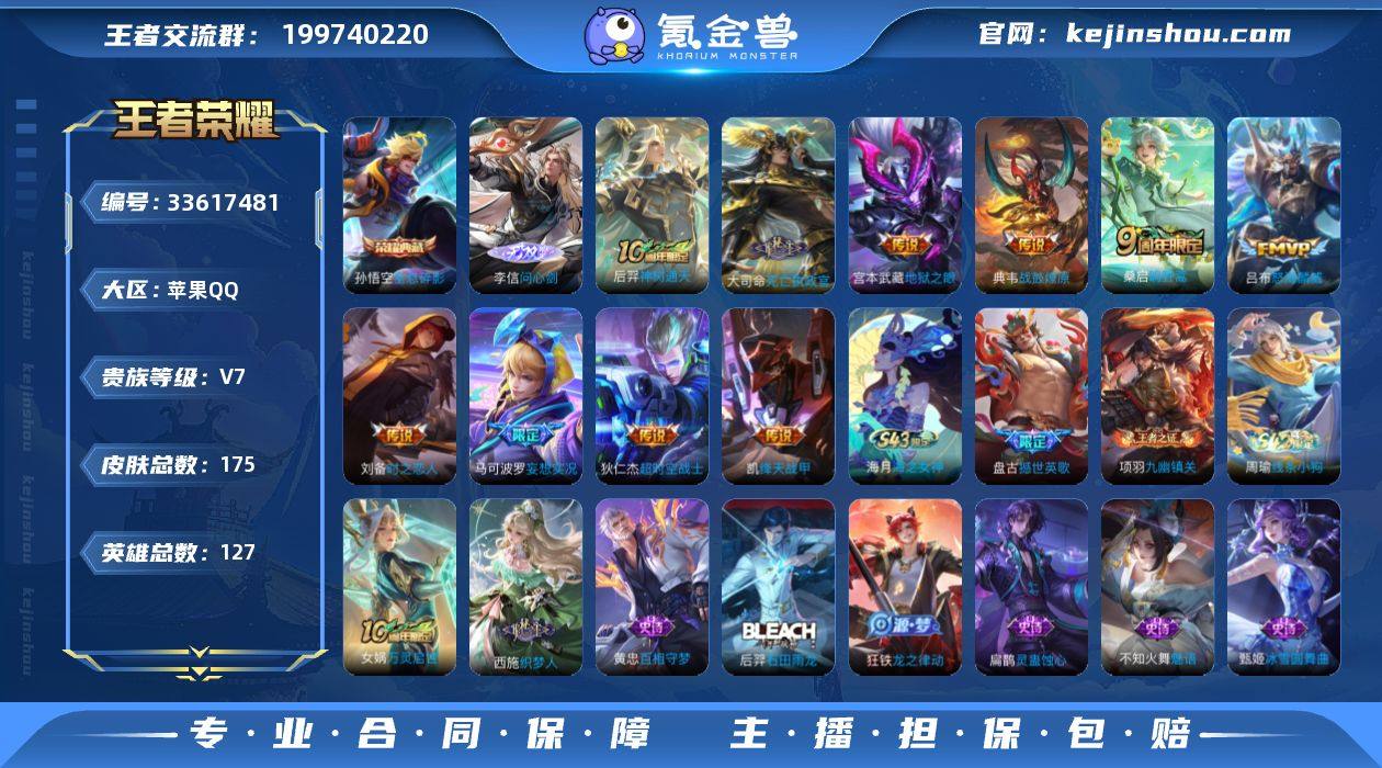 CHC40098 苹果Q-V7-至尊星耀III段位-127英雄-175皮肤-1典藏皮肤-1无双-10传说-42史诗 【英雄全皮】:孙权全皮,影全皮 【荣耀典藏】:孙悟空全息碎影 【无双皮肤】:李信问心剑 【传说皮肤】:后羿神树通天,大司命死亡执政官,桑启鸣野蒿,典韦战鼓燎原,马可波罗妄想实况,吕布怒海麟威,铠绛天战甲,刘备时之恋人,宫本武藏地狱之眼,狄仁杰超时空战士 【限定皮肤】:姜子牙天穹之誓,狄仁杰阴阳师,赵云皇家上将,白起夜都怪侠,元歌无心,马可波罗妄想实况,狄仁杰魔术师,项羽海滩派对,兰陵王金庭之子,李元芳云中旅人,蔡文姬繁星吟游,鬼谷子五谷丰年,沈梦溪大漠名商,明世隐吟游魔法,鲁班大师探海日志,桑启海盐诗旅,艾琳女武神,阿古朵江河有灵,张良古海寻踪,蒙恬荣光圣徽,鬼谷子天穹祈灯,沈梦溪龙舞盛年,刘邦剑破天穹,程咬金群星魔术团 【赛季限定】:兰陵王金庭之子,沈梦溪大漠名商,李元芳云中旅人,桑启海盐诗旅,鲁班大师探海日志,张良古海寻踪,鬼谷子天穹祈灯,刘邦剑破天穹,姜子牙天穹之誓,东皇太一噬灭天穹,太乙真人谧流熔炉,钟馗虚灵犬护,甄姬逆浪荇歌,亚瑟荣光之誓,蒙恬荣光圣徽,项羽九幽镇关 【战令限定】:明世隐吟游魔法,白起夜...