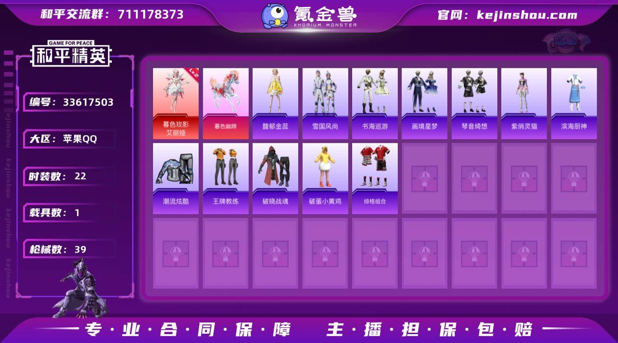 苹果 手Q-1神装-0粉装-0特效枪-1载具-2粉色飞行器-12881热力值-1王牌印记-22套装-39枪皮 【红色神装等级】:暮色玫影-艾丽娅(二级) 【红色角色神装】:暮色玫影-艾丽娅 【粉色载具】:暮色幽蹄 【粉色飞行器】:炫彩糖果飞行器,暮色之舞飞行器 【粉色降落伞】:雪月幻音降落伞,炫彩糖果降落伞,暮色玫影降落伞 【稀有套装】:套装-雪国风尚,套装-炫彩糖果,角色-紫俏灵猫,套装-书海巡游,套装-画境星梦,套装-琴音绮想,角色-馥郁金蕊 【稀有枪皮】:AUG-冰晶雪宝,AKM-破晓战魂,SCAR-L-炫彩节奏,GROZA-暮色玫影,AUG-绝对恒星,ACE32-画境星梦,UZI-炫彩节奏,汤姆逊-天降萌叽,MP5K-画境星梦,M24-炫彩节奏,AWM-暮色玫影,M1加兰德-画境星梦,S12K-极意拳锋,AA12-G-画境星梦,MG3-幻世战舞者,突击盾牌-绝对恒星,撬棍-暮色玫影,平底锅-画境星梦 【其他套装】:套装-滨海厨神,套装-潮流炫酷,套装-王牌教练,套装-破晓战魂,套装-破蛋小黄鸡,套装-绯格组合 【营地ID】:1021404107