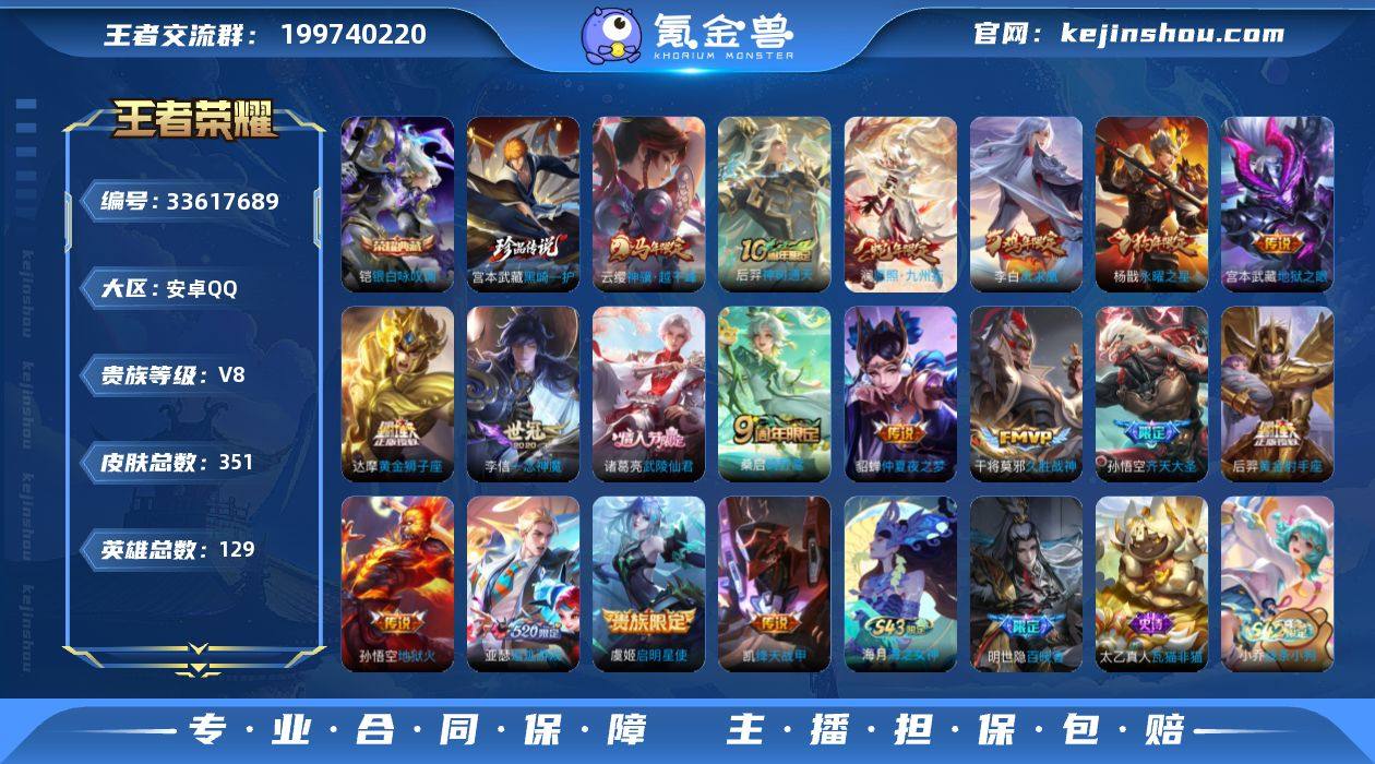 【精品号手慢无】351皮1典藏1珍品传说18传说皮;星传说幽冥之眼;13按键1签名;银白咏叹调,黑崎一护,凤求凰,梅西,神骥·越千峰,冰锋战神,愿照·九州拓;英雄全皮(5)鲁班大师全皮,影全皮,孙权全皮,敖隐全皮,大禹全皮。夺宝191抽,6颗王者水晶。