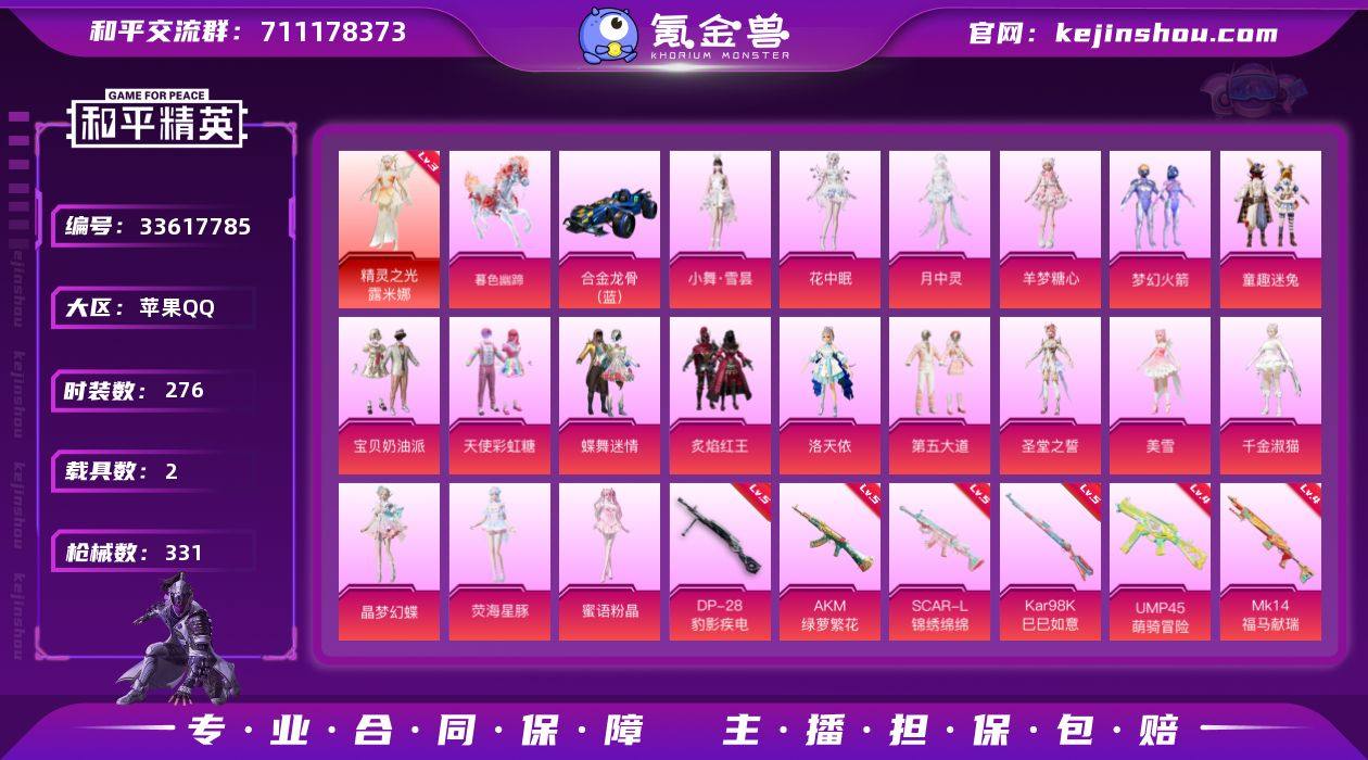苹果 手Q-1神装-18粉装-9特效枪-2载具-9粉色飞行器-110691热力值-17王牌印记-276套装-331枪皮 【红色神装等级】:精灵之光-露米娜(三级) 【红色角色神装】:精灵之光-露米娜 【热门品类】:粉装-梦幻火箭,粉装-童趣迷兔,套装-浪漫天命,套装-龟仙人,套装-潮萌小黄鸭,套装-浪漫波比,熔岩游骑兵连帽夹克,套装-红熊茄茄 【粉色套装】:粉装-宝贝奶油派,粉装-天使彩虹糖,粉装-蝶舞迷情,粉装-梦幻火箭,粉装-童趣迷兔,粉装-炙焰红王,角色-洛天依,粉装-第五大道,角色-圣堂之誓,角色-美雪,角色-千金淑猫,角色-晶梦幻蝶,角色-荧海星豚,角色-羊梦糖心,角色-花中眠,角色-月中灵,人物-小舞·雪昙,角色-蜜语粉晶 【粉色枪皮等级】:AKM-绿萝繁花(五级),SCAR-L-锦绣绵绵(五级),GROZA-精灵之光(三级),UMP45-萌骑冒险(四级),AKS-74U-森灵之息(四级),Kar98K-巳巳如意(五级),Mk14-福马献瑞(四级),M417-第五大道(二级),DP-28-豹影疾电(五级) 【粉色载具】:合金龙骨(蓝),暮色幽蹄 【粉色枪皮】:AKM-绿萝繁花,SCAR-L-锦绣绵绵,GROZA-精灵之光,UMP45-萌骑冒险,AKS-74U-森灵之息,Kar98K-巳巳如意,Mk14-福马献瑞,M417-第五大道,DP-28-豹影疾电 【粉色飞行...