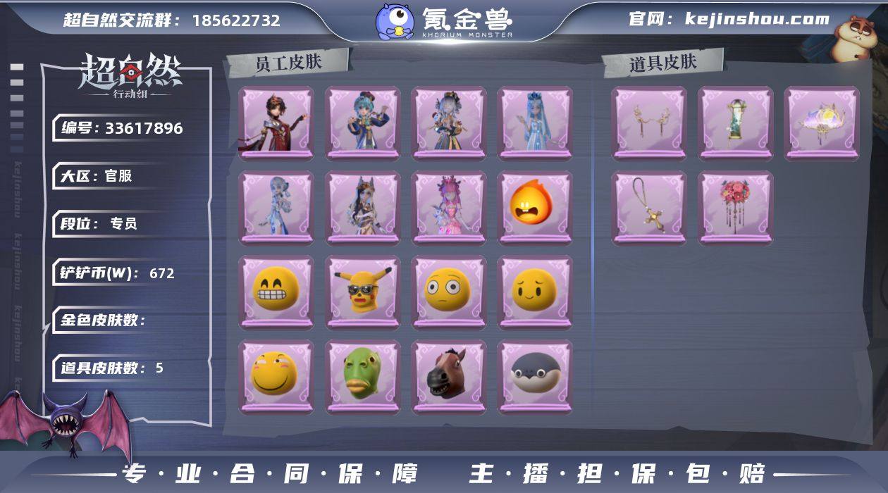 ZR946,紫皮:7,道具皮:5,外观:巫铃儿-素影瑶光,莉莉-情公主,阿念-迷途僵宝,爱丽丝-冰公主,薇薇安-白光莹,莉莉-除妖小师妹,薇薇安-仙锋小姐,道具:夜视仪-敛花容,折扇-赴此良宵,摸金符-祝祷词,额外的背包-飞花令,传送按钮-浮生一梦,饰品:头饰-哈士奇头套,头饰-呆滞头套,头饰-滑稽头套,头饰-烈焰红唇头套,头饰-嘻嘻头套,头饰-鱼头怪头套,头饰-面具马头套,头饰-卑微头套,头饰-火爆了头套,头饰-萨卡班甲鱼头套,头饰-像素朋克墨镜,头饰-后室幸存者头套,挂饰-小鲨包包,挂饰-未竟乐园,挂饰-天使消失的年代,挂饰-钗头凤,背饰-云梦之星,背饰-牛啤背包,背饰-小小情公主,背饰-天使的呼唤,动作:动作-心跳摇,动作-舞台中心,动作-金城舞,动作-luvaboy,动作-抬手,动作-举牌,工牌背景:工牌背景-花蕾城堡,工牌背景-圣光之誓,工牌背景-流金照庭,工牌背景-佛系小豚,工牌背景-情语塔,工牌背景-冰晶宫,工牌动作:工牌动作-虔诚之姿,工牌动作-轻躯鹤立,员工:薇薇安,逍遥,小满,莉莉,兰,巫铃儿,爱丽丝,零,小黄,爱德华,阿念,累充:928元,铲铲币:672.3万,金砖:14,段位:专员Ⅲ,魔盒等级:1