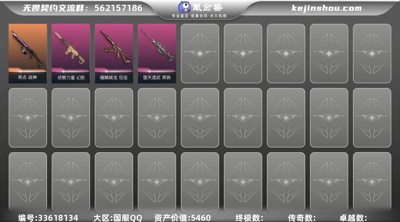 96002|黑铁II 皮肤价值5460 已用晶源270 皮肤数量14 限定1 卓越3 奢华4 精选6【拥有皮肤】奇点 战神,堕天遗武 冥驹,侦察力量 幻影,耀鳞威龙 狂徒 ,星际猎兵 飞将,星际猎兵 幻影,星际猎黑铁II 皮肤价值5460 已用晶源270 皮肤数量14 限定1 卓越3 奢华4 精选6【拥有皮肤】奇点 战神,堕天遗武 冥驹,侦察力量 幻影,耀鳞威龙 狂徒 ,星际猎兵 飞将,星际猎兵 幻影,星际猎兵 判官,无限竞技 骇灵,光环序列 战神,光环序列 戍卫,瑰梦艺语 雄鹿,瑰梦艺语 骇灵,光环序列 狂怒,瑰梦艺语 鬼魅 英雄数量14 卡面数量29 喷漆数量20 挂饰数量28【拥有卡面】战术特工 卡面,画笔战术 卡面,追猎设计图 卡面 ,尽情舞动 卡面,V25:巴黎序曲 卡面,禁灭工牌 卡面,月下珍馐 卡面,再火一回 卡面,身陷蝰腹 卡面,5周年:为你而战 卡面,5周年:颠覆战局 卡面,5周年:流光似箭 卡面,TB-01 战术巨熊 卡面,星际猎兵 卡面,光环序列 卡面,5周年:掌控全局 卡面,第五季//异界洞开 卡面,大军“鸭”境 卡面,第四季//破局时刻 卡面,无畏契约GO!第一卷:零 卡面,无畏契约GO!第一卷:芮娜 卡面,新兵报到 卡面,代号红色 卡面,看镜头 卡面,惊吓战术 卡面,别冒尖 卡面,V契约 卡面,5周年:薪火初燃 卡面,无畏契约 卡面【拥有喷...