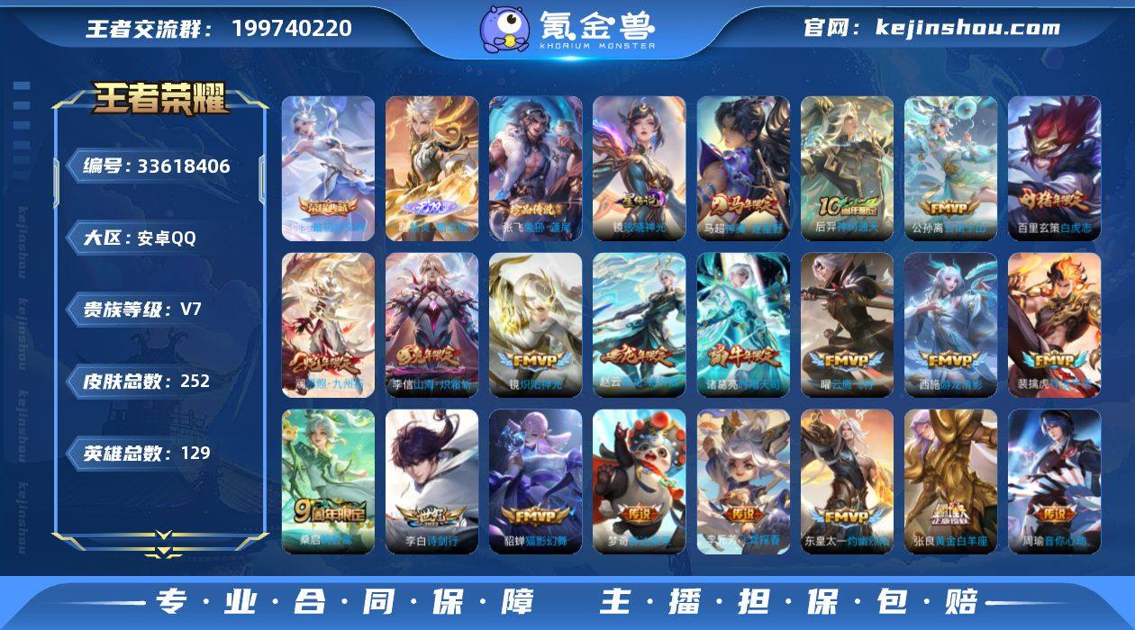 可换绑【精品小号·3金标·伽罗典藏·曜无双·张飞珍品·李信兔限·赵云龙限·白虎志·时雨天司·白鹤梁神女·飞衡】 8079星币 10按键,1星传说,9王者印记,五级铭文210,可二次,安卓Q-V7-252皮肤-1典藏皮肤-1无双-1珍品传说-20传说-91史诗【英雄全皮】:孙权全皮,鬼谷子全皮,敖隐全皮,影全皮【荣耀典藏】:伽罗最初的交响【无双皮肤】:曜器灵螭龙剑【珍品传说】:张飞兔狲蓬尾【星元皮肤】:镜破晓神光【传说皮肤】:马超神骥逐星野,后羿神树通天,公孙离云诺千山,澜愿照九州拓,裴擒虎祥瑞亨通,桑启鸣野蒿,赵云乘龙铭钟鼎,东皇太一灼幽烈阳,李信山海炽霜斩,李白诗剑行,西施游龙清影,周瑜音你心动,李元芳飞鸢探春,诸葛亮时雨天司,镜炽阳神光,曜云鹰飞将,貂蝉猫影幻舞,张良黄金白羊座,百里玄策白虎志,梦奇胖达荣荣【限定皮肤】:暃埋骨钱,蒙犽顽岩魄,蔡文姬夏日便利店,大乔绒语心约,虞姬夏日便利店,姜子牙天穹之誓,杨戬破阵退雄兵,狄仁杰阴阳师,赵云皇家上将,庄周云端筑梦师,高渐离玩趣恶龙,周瑜赤莲之焰,元歌无心,马可波罗山海玄木吟,狄仁杰魔术师,狄仁杰万华元夜,项羽海滩派对,老夫子醍醐杖,韩信飞衡,孙悟空至尊宝,后羿如梦令,李元芳云中...