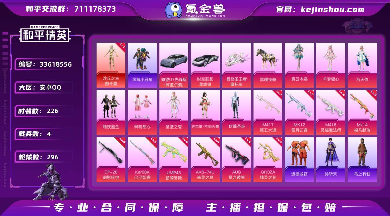 安卓 手Q-1神装-8粉装-10特效枪-4载具-11粉色飞行器-102222热力值-14王牌印记-226套装-296枪皮 【红色神装等级】:沙丘之主-图卡盟(一级) 【红色角色神装】:沙丘之主-图卡盟 【热门品类】:套装-深海小丑鱼,旭日初心兜帽大衣,套装-龟仙人,套装-粉红小猪,角色-Mark.06 【粉色套装】:角色-洛天依,粉装-暗夜鎏金,粉装-飒粉甜心,角色-圣堂之誓,角色-狂花道·不知火舞,角色-伏羲圣卦,角色-羊梦糖心,角色-辉云木星 【粉色枪皮等级】:M416-灵猫魔法师(六级),GROZA-精灵之光(三级),AUG-星之彼岸(四级),UMP45-萌骑冒险(四级),AKS-74U-森灵之息(四级),Kar98K-巳巳如意(五级),Mk14-福马献瑞(五级),M417-第五大道(七级),MK12-雪月幻音(七级),DP-28-豹影疾电(五级) 【粉色载具】:仰望U7(阿盖尔紫),时空跃影(星辉银),最终圣卫者摩托车,黑曜夜骑 【粉色枪皮】:M416-灵猫魔法师,GROZA-精灵之光,AUG-星之彼岸,UMP45-萌骑冒险,AKS-74U-森灵之息,Kar98K-巳巳如意,Mk14-福马献瑞,M417-第五大道,MK12-雪月幻音,DP-28-豹影疾电 【粉色飞行器】:香车宝马飞行器,炫彩糖果飞行器,齐天大圣飞行器,沙丘之主天马,幻海精灵飞行器,曦光华影飞行器,圣域金龙飞...