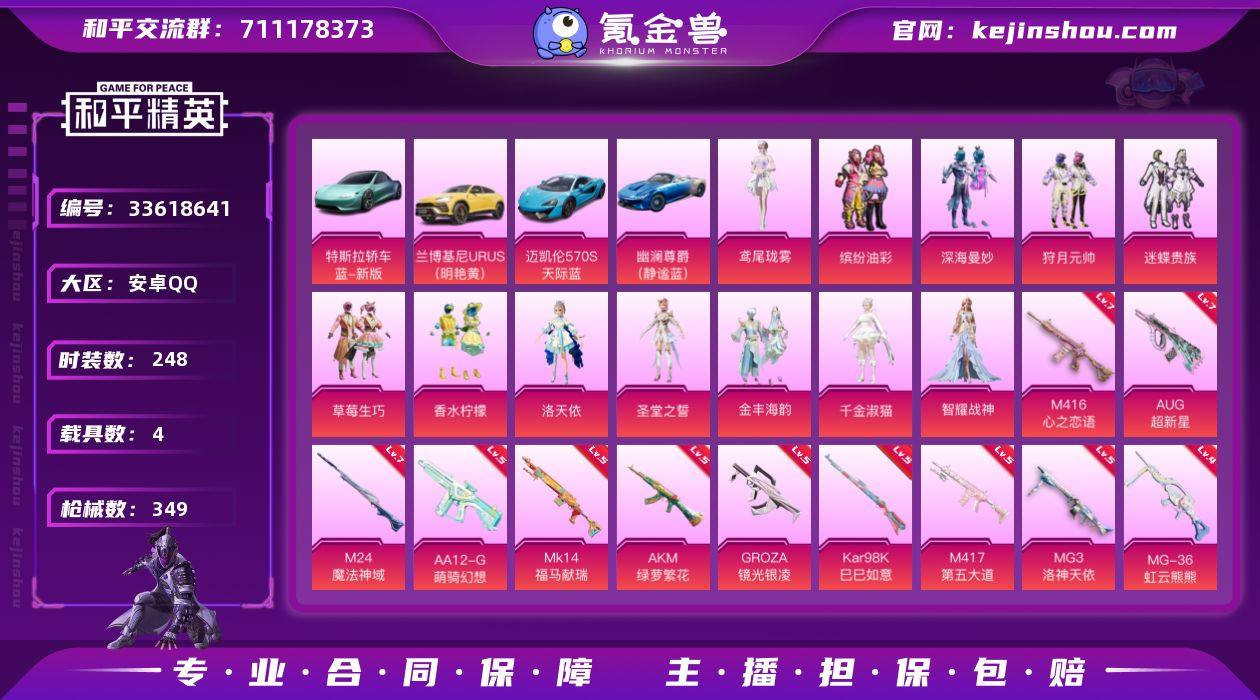 【kyhp1781】安卓 手Q-12粉装-16特效枪-4载具-6粉色飞行器-120039热力值-28王牌印记-248套装-349枪皮 【热门品类】:粉装-缤纷油彩,套装-SS1特训,套装-龟仙人,套装-潮萌小黄鸭,套装-粉红小猪,角色-Mark.06 【粉色套装】:粉装-深海曼妙,粉装-缤纷油彩,粉装-狩月元帅,粉装-迷蝶贵族,粉装-草莓生巧,粉装-香水柠檬,角色-洛天依,角色-圣堂之誓,粉装-金丰海韵,角色-千金淑猫,角色-智耀战神,角色-鸢尾珑雾 【粉色枪皮等级】:AKM-绿萝繁花(五级),AKM-魔法神域(三级),SCAR-L-时空协奏(三级),M416-心之恋语(七级),GROZA-镜光银凌(五级),AUG-超新星(七级),Kar98K-巳巳如意(五级),M24-魔法神域(七级),Mk14-福马献瑞(五级),M417-第五大道(五级),MK12-雪月幻音(四级),AA12-G-萌骑幻想(五级),DP-28-豹影疾电(四级),MG3-洛神天依(五级),MG-36-虹云熊熊(四级) 【粉色载具】:特斯拉Roadster(水滴蓝),兰博基尼URUS(明艳黄),迈凯伦570S(天际蓝),幽澜尊爵(静谧蓝) 【粉色枪皮】:AKM-绿萝繁花,AKM-魔法神域,SCAR-L-时空协奏,M416-心之恋语,GROZA-镜光银凌,AUG-超新星,Kar98K-巳巳如意,M24-魔法神域,Mk14-福马献瑞,M417-第五大道,MK12-雪月幻...