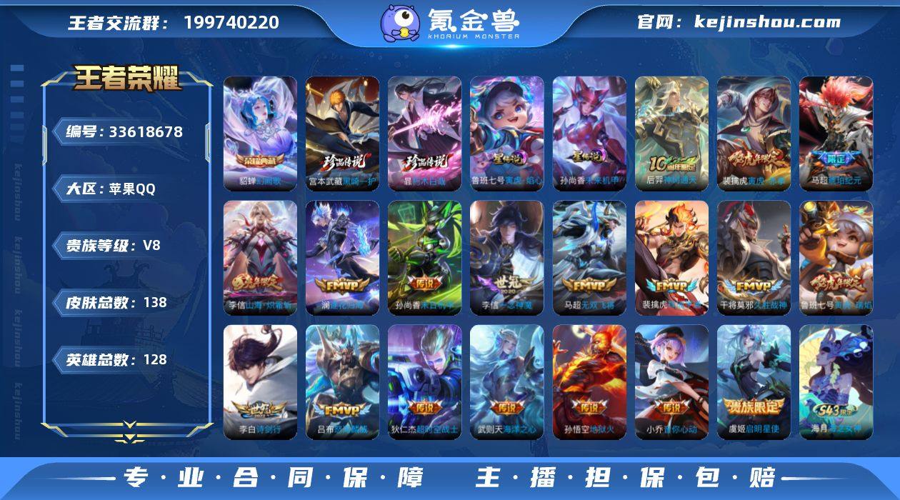 可换绑【多限定精品号·金标李信·典藏貂蝉·珍品暃宫本·马超琥珀纪元·兔年李信·虎年鲁班老虎·冰霜恋舞曲·至尊宝·】 19按键,2星传说,9王者印记,五级铭文220,可二次,苹果Q-V8-138皮肤-1典藏皮肤-2珍品传说-18传说-41史诗【英雄全皮】:孙权全皮【荣耀典藏】:貂蝉幻阙歌【珍品传说】:宫本武藏黑崎一护,暃朽木白哉【星元皮肤】:孙尚香未来机甲,鲁班七号寅虎焰心【传说皮肤】:后羿神树通天,裴擒虎祥瑞亨通,马超琥珀纪元,澜逐花归海,李信山海炽霜斩,吕布怒海麟威,李白诗剑行,马超无双飞将,裴擒虎寅虎赤拳,鲁班七号寅虎瑞焰,小乔音你心动,虞姬启明星使,李信一念神魔,干将莫邪久胜战神,孙尚香末日机甲,孙悟空地狱火,武则天海洋之心,狄仁杰超时空战士【限定皮肤】:狄仁杰阴阳师,赵云皇家上将,鲁班七号寅虎瑞焰,元歌无心,马可波罗山海玄木吟,狄仁杰魔术师,狄仁杰万华元夜,达摩沙漠行僧,项羽海滩派对,老夫子醍醐杖,程咬金演武夺筹,兰陵王金庭之子,孙悟空至尊宝,李元芳云中旅人,虞姬启明星使,钟馗驱傩正仪,干将莫邪冰霜恋舞曲,雅典娜黎明之约,鬼谷子原初探秘者,鬼谷子五谷丰年,苏烈千军破阵,梦奇顽趣,裴擒虎寅虎赤拳,裴擒虎擒涛扼浪,...