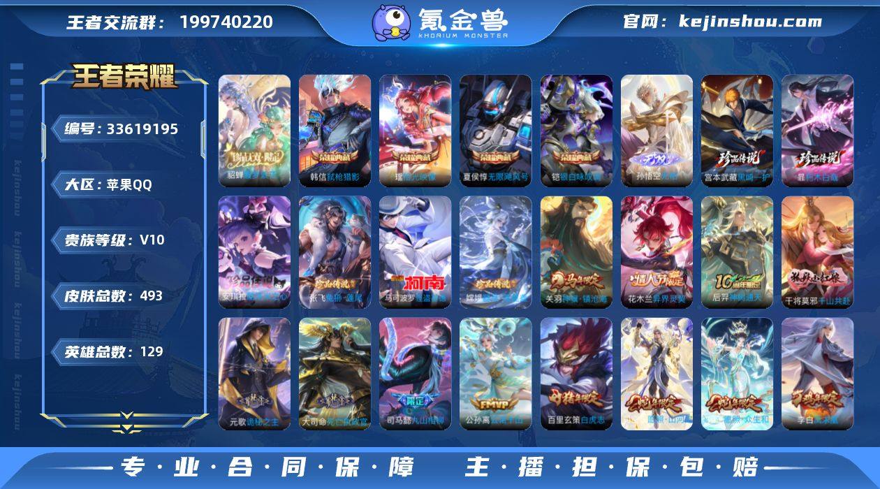 MCK634311 【繁花+黑崎双天幕!繁花貂蝉!无相!瑶4典藏!基德6珍品!】 皮肤数量493 印记总数18 【V10】 【至尊星耀】 【可修改】 账号类型7 省标(金标)2 天幕2 珍品无双1 无双1 荣耀典藏4 珍品6 传说63 史诗141 账号类型:女号,中单号,软辅号,射手号,全能号,打野号,上单号; 省标(金标):省金标司马懿,省金标雅典娜; 天幕:天幕-繁花交响诗,天幕-黑崎一护; 珍品无双:貂蝉_馥梦繁花; 无双:孙悟空_无相; 荣耀典藏:铠_银白咏叹调,瑶_拾光映像,韩信_弑枪猎影,夏侯惇_无限飓风号; 珍品:宫本武藏_黑崎一护,暃_朽木白哉,安琪拉_酷洛米之心,张飞_兔狲蓬尾,嫦娥_器灵落星盏,马可波罗_怪盗基德; 传说:艾琳_觅芳踪,孙膑_小动物乐团,小乔_音你心动,海月_金乌负日,李元芳_飞鸢探春,露娜_霜月吟,花木兰_异界灵契,关羽_神骥·镇沧海,武则天_海洋之心,梦奇_胖达荣荣,朵莉亚_心动手记,后羿_神树通天,花木兰_燃星之曲,干将莫邪_千山共赴,元歌_诡秘之主,大司命_死亡执政官,司马懿_九山相柳,亚连_落雪白狼,甄姬_至美化雀舞,典韦_战鼓燎原,公孙离_云诺千山,蔡文姬_愿照福禄聚,女娲_愿照千秋盛,妲己_愿照众生和,杨玉环_星之鸣奏,王昭君_乞...