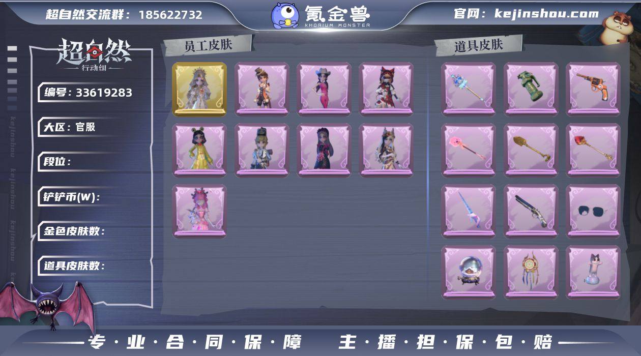 金皮1;紫皮8;道具皮24;皮肤:薇薇安-圣光之谕,薇薇安-白光莹,莉莉-莓果陷阱,阿念-庆宴绮愿,阿念-王子与骑士,莉莉-情公主,爱丽丝-耀眼的你,小黄-呱呱雨衣,爱丽丝-丝缕哀歌;道具:铲子-龙鳞,铲子-赞萌波板糖,急救包-蔷薇物语,铲子-圣心之泪,音响-happy猫,电击枪-权杖的许诺,闪光弹-金戈玄铜,音响-鸣沙鼓,短管猎枪-星光的裁决,夜视仪-金丝眼镜,音响-冬夜暖忆,转轮手枪-新星时代,桃木剑-最后的独角兽,长鞭-小狗蛇点点鞭,专业手电-云端梦想计划,腰包-惊魂娃娃,长枪-罪棘,摸金符-祝祷词,摸金符-花落精绝,腰包-宝剑八,长枪-糖葫芦霸王枪,伞-郁金春信,喷气背包-乘风溯雪,额外的背包-飞花令;饰品:头饰-炙热烧烤,头饰-小狗蛇点点头套,头饰-煤球喵头套,头饰-鱼头怪头套,头饰-大葱明头套,头饰-樱桃奶油布丁,头饰-惊魂南瓜头套,头饰-嘻嘻头套,头饰-青团糯糯,头饰-烛光纪念,头饰-蒜了八,头饰-面具马头套,头饰-雪墩墩头套,头饰-火爆了头套,头饰-太空鲨头套,头饰-滑稽头套,头饰-烈焰红唇头套,头饰-马上有钱,头饰-萨卡班甲鱼头套,头饰-哈士奇头套,头饰-呆滞头套,头饰-芝麻糊汤圆,头饰-卑微头套,头饰-像素朋克墨镜,头饰-后室幸存者头套,挂饰-晚安小熊,挂饰-小鲨包包,挂饰-未竟乐园,挂饰-天...