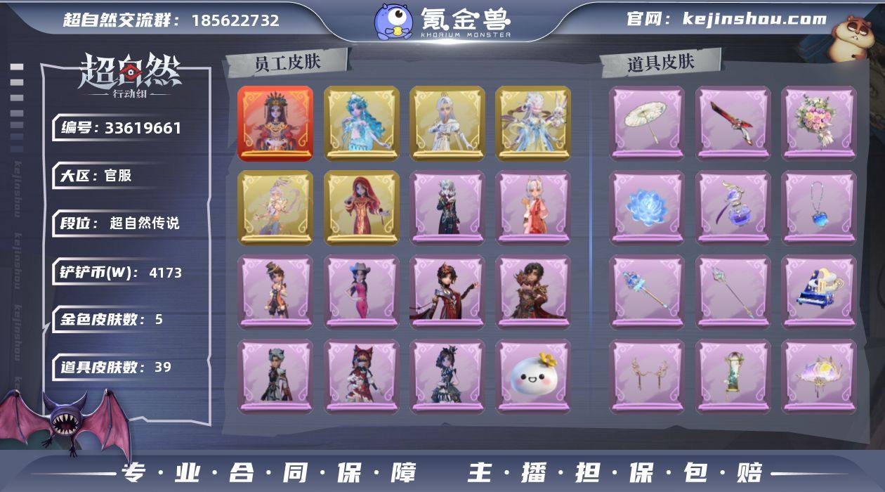 ZR963,红皮:1,金皮:5,紫皮:9,道具皮:39,外观:巫铃儿-镜生遗梦,薇薇安-海月息潮,逍遥-剑仙,莉莉-瑶台梦,逍遥-莲华渡,巫铃儿-镜花辞,小黄-异色序曲,薇薇安-仙锋小姐,艾伦-黎明猎手,阿念-庆宴绮愿,爱德华-梵卓之礼,莉莉-莓果陷阱,临云-织锦云程,爱丽丝-耀眼的你,零-搬开山,道具:桃木剑-寂潮之刃,传送按钮-昆仑镜,伞-郁金春信,长鞭-缚誓之锁,短管猎枪-赞萌露比水枪,音响-月光奏鸣曲,葫芦-伏妖塔,专业手电-花束般的告白,急救包-蔷薇物语,腰包-私藏的银河,额外的背包-灵感泉之花,腰包-红运福虎,刺刀-铂刺与红萼,音响-happy猫,夜视仪-敛花容,桃木剑-小羊波德莱尔剑,急救包-土拨鼠捏捏,额外的背包-飞花令,摸金符-海洋之心,除颤仪-冰晶般的代价,刺刀-紫气东来,长枪-糖葫芦霸王枪,腰包-宝剑八,夜视仪-金丝眼镜,长鞭-新春炸响,桃木剑-凤鸣九天,喷气背包-乘风溯雪,闪光弹-金戈玄铜,短管猎枪-安魂曲,传送按钮-浮生一梦,电击枪-权杖的许诺,长枪-罪棘,长枪-波塞冬,铲子-龙鳞,折扇-赴此良宵,腰包-惊魂娃娃,黄牛能量饮料-青玉抱丹,黄牛能量饮料-珍珠芭乐莓莓,黄牛能量饮料-无人岸,美妆:美妆-萌兔气泡,美妆-暗夜小恶魔,美妆-启明星,饰品:头饰-青团糯糯,头饰-小财神豚豚头套,头饰-呆滞头套,头饰-...