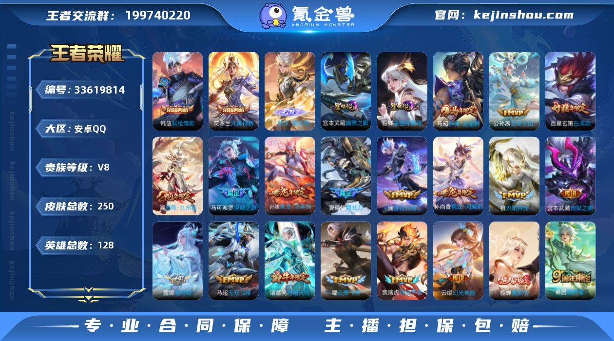 MCK634302 【曜无双!韩信 花木兰典藏!】 皮肤数量250 印记总数6 【V8】 【永恒钻石】 【可修改】 账号类型3 无双1 荣耀典藏2 星元皮肤2 传说25 史诗80 账号类型:射手号,打野号,上单号; 无双:曜_器灵螭龙剑; 荣耀典藏:花木兰_九霄神辉,韩信_弑枪猎影; 星元皮肤:貂蝉_金色仲夏夜,宫本武藏_幽冥之眼; 传说:马超_神骥·逐星野,百里玄策_白虎志,干将莫邪_久胜战神,宫本武藏_地狱之眼,马超_无双飞将,公孙离_云诺千山,虞姬_启明星使,裴擒虎_祥瑞亨通,云缨_幻光神枪,澜_愿照九州拓,露娜_霜月吟,马可波罗_妄想实况,桑启_鸣野蒿,镜_炽阳神光,夏侯惇_霜北刀,澜_电玩雷克斯,诸葛亮_时雨天司,曜_云鹰飞将,澜_逐花归海,云中君_群星魔术团,刘备_时之恋人,孙尚香_乘龙问璇玑,貂蝉_曦玄引,孙策_乘龙淬吴钩,马可波罗_深海之息; 史诗:小乔_线条小狗,哪吒_雪上飞焰,元歌_无心,周瑜_线条小狗,夏侯惇_乘风破浪,牛魔_星界战将,阿珂_节奏热浪,杨戬_天秀启明,兰陵王_傩神司,莱西奥_光弋星穹,女娲-万灵启世,曹操_幽灵船长,公孙离_涂山容容,黄忠-百相守梦,程咬金_功夫厨神,后羿_石田雨龙,扁鹊_奇幻香踪,露娜_紫霞仙子,刘禅_鸭鸭历险记,狂铁_...