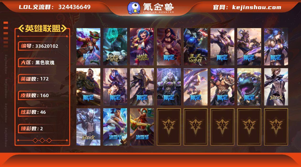 黄金段位-172英雄-160皮肤-46炫彩-0终极-3神话-23限定-20传说-37史诗 【神话皮肤】:十周年纪念安妮,源代码乐芙兰,十五周年纪念希维尔 【臻彩皮肤】:冠军之刃锐雯2016凯旋圣装,魔女阿卡丽虚荣 【年限皮肤】:定海神珍孙悟空 【冰雪限定】:阿木木“主人不要我了”,平安夜女神娑娜,冬季仙境卡尔玛 【限定皮肤】:iG菲奥娜,EDG佛耶戈,T1纳尔,T1永恩,暗裔英雄盖伦,胜利枪神格雷福斯,胜利女神奥莉安娜,胜利枪神卢锡安,胜利女神瑟庄妮,胜利凤凰艾尼维亚,胜利之王泰达米尔,胜利巨口克格莫,胜利女神娑娜,胜利剑圣易,胜利之运崔斯特,胜利女神菲奥娜,女猎手希维尔,防暴天使凯尔 【传说皮肤】:铁哥们儿奥拉夫,魔幻卡牌崔斯特,邪鸦魅影乐芙兰,战场女武神凯尔,源计划林易,恶魔男爵瑞兹,霸天零式赛恩,提莫约德尔人的一大步,烈焰雄心崔丝塔娜,合金巨兽努努和威朗普,绅士科加斯,律政大亨蒙多,最终BOSS维迦,战斗学院凯特琳,苹果机器人布里茨,炼狱魔犬内瑟斯,星之守护者阿卡丽,宇航员诺提勒斯,泳池派对吉格斯,西部魔影卢锡安 【史诗皮肤】:摄魂男爵弗拉基米尔,铁钩船长费德提克,圣光审判凯尔,战争机器赛恩,紫晶射手艾希,百夫长贾克斯,贵族血统...