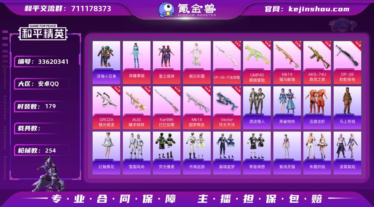 【kyhp1820】安卓 手Q-3粉装-10特效枪-0载具-2粉色飞行器-65751热力值-14王牌印记-179套装-254枪皮 【热门品类】:套装-深海小丑鱼,套装-小丑鱼,角色-军刀雅典娜,套装-忍者信条,套装-龟仙人 【粉色套装】:粉装-星之彼岸,角色-烟云彩露,角色-异瞳寒姬 【粉色枪皮等级】:GROZA-镜光银凌(五级),AUG-暖羊咩咩(五级),UMP45-萌骑冒险(五级),Vector-环太平洋(四级),AKS-74U-森灵之息(五级),Kar98K-巳巳如意(五级),Mk14-甜梦熊击(五级),Mk14-福马献瑞(五级),DP-28-千金淑猫(七级),DP-28-豹影疾电(五级) 【粉色枪皮】:GROZA-镜光银凌,AUG-暖羊咩咩,UMP45-萌骑冒险,Vector-环太平洋,AKS-74U-森灵之息,Kar98K-巳巳如意,Mk14-甜梦熊击,Mk14-福马献瑞,DP-28-千金淑猫,DP-28-豹影疾电 【粉色飞行器】:炫彩糖果飞行器,星之彼岸飞行器 【粉色降落伞】:海渊国主降落伞,创世·救赎降落伞,临安公主降落伞,幻彩电音降落伞,异瞳寒姬降落伞,炫彩糖果降落伞 【稀有套装】:套装-龟仙人,套装-巳巳如意,套装-乐游熊熊,套装-荧光像素,套装-雪国风尚,套装-炫彩糖果,套装-马上有钱,套装-迅捷龙虾,套装-遗迹猎人,套装-雏菊兔兔,套装-萝兰蝴蝶,套装-小熊娃娃,...