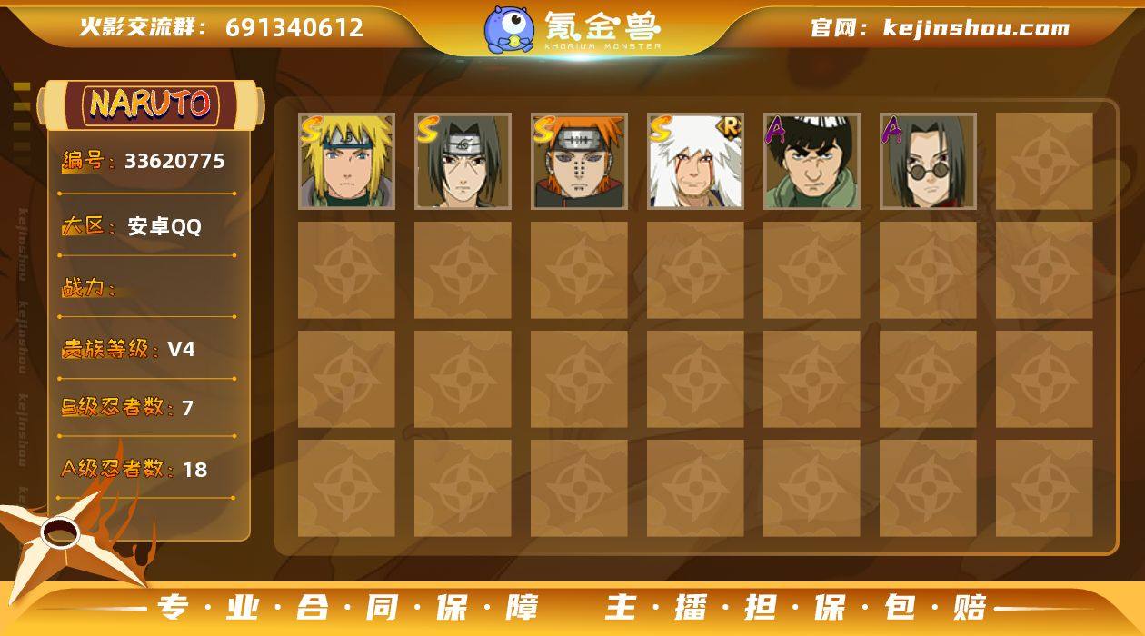 【7s18a】安卓QQ-新手入坑免肝免氪首选-S忍者数:7- A忍者数:18 【S级忍者】宇智波斑「秽土转生·解」(4星),千手扉间「秽土转生」(3星),自来也「舞之豪杰」(3星),宇智波鼬「须佐能乎」(3星),漩涡鸣人·宇智波佐助(3星),佩恩「天道」(3星),波风水门(3星), 【A级忍者】迪达拉「秽土转生」(2星),千代「近松十人卫」(2星),秋道丁次「忍界大战」(2星),宇智波泉奈(2星),干柿鬼鲛(2星),猿飞阿斯玛(2星),迈特凯(2星),我爱罗「疾风传」(2星),飞段「死司凭血」(2星),宇智波鼬(2星),波风水门「青年」(2星),日向宁次「忍界大战」(2星),旗木卡卡西「神威对决」(2星),小南「神驹佑将」(2星),宇智波鼬「夏日限定」(2星),迈特凯「青春爆炸」(2星),机械鸣人「初始形态」(2星),土台「忍界大战」(2星),