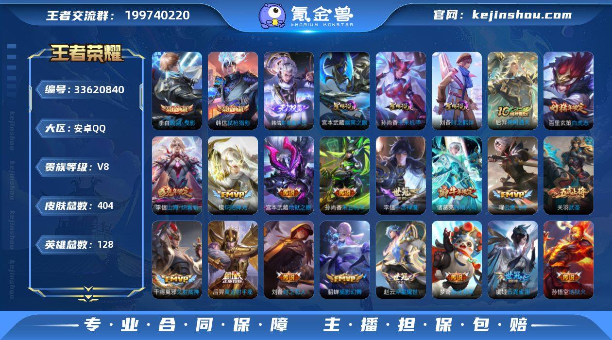 V8 2典藏 1无双 21传说 3星元 404皮肤 128英雄 【2水晶】李白-鸣剑·曳影,韩信-弑枪猎影【1无双】韩信-群星魔术团【21传说】李信-山海·炽霜斩,百里玄策-白虎志,貂蝉-猫影幻舞,干将莫邪-久胜战神,宫本武藏-地狱之眼,关羽-武圣,后羿-黄金射手座,镜-炽阳神光,铠-绛天战甲,李信-一念神魔,刘备-时之恋人,梦奇-胖达荣荣,孙尚香-末日机甲,孙悟空-地狱火,虞姬-云霓雀翎,虞姬-启明星使,赵云-淬星耀世,周瑜-音你心动,诸葛亮-时雨天司,曜-云鹰飞将,后羿-神树通天【3星元】刘备-时之羁绊,孙尚香-未来机甲,宫本武藏-幽冥之眼【115史诗】元歌-无心,鬼谷子-五谷丰年,赵云-未来纪元,钟无艳-超时空战士,狂铁-电玩高手,阿轲-暗夜猫娘,阿轲-节奏热浪,阿轲-迷踪丽影,安琪拉-心灵骇客,安琪拉-时之奇旅,白起-星夜王子,百里守约-特工魅影,百里守约-朱雀志,百里玄策-原初追逐者,百里玄策-热力回旋,不知火舞-魅语,蔡文姬-舞动绿茵,曹操-幽灵船长,蔡文姬-繁星吟游,嫦娥-拒霜思,程咬金-功夫厨神,妲己-女仆咖啡,妲己-魅力维加斯,大乔-猫狗日记,大乔-白蛇,狄仁杰-魔术师,狄仁杰-鹰眼统帅,貂蝉-圣诞恋歌,伽罗-箭羽风息,伽罗-天狼溯光者,干将莫邪-真爱魔法,公孙离-无限星赏官,宫本武藏-鬼剑武藏,韩信-飞衡,韩信...
