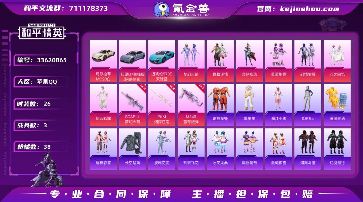 【A11583】苹果【小号/梦幻火箭/7粉装-3特效枪-3载具-1粉色飞行器】 手Q--17466热力值-2王牌印记-26套装-38枪皮 【热门品类】:粉装-梦幻火箭,套装-粉红小猪 【粉色套装】:粉装-蝶舞迷情,粉装-梦幻火箭,粉装-沙场疾风,粉装-蓝莓炮弹,粉装-幻情紫藤,粉装-心之回忆,角色-烟云彩露 【粉色枪皮等级】:SCAR-L-梦幻火箭(四级),M249-蓝莓炮弹(一级),PKM-江南烟雨(二级) 【粉色载具】:玛莎拉蒂MC20(星石白),仰望U7(阿盖尔紫),迈凯伦570S(天际蓝) 【粉色枪皮】:SCAR-L-梦幻火箭,M249-蓝莓炮弹,PKM-江南烟雨 【粉色飞行器】:春暖花开飞行器 【粉色降落伞】:春暖花开降落伞,梦幻火箭降落伞,蓝莓炮弹降落伞,纯梦嫁纱降落伞,江南烟雨降落伞 【稀有套装】:套装-迅捷龙虾,玩偶服-懒羊羊 【稀有枪皮】:AKM-春暖花开,AKM-江南烟雨,SCAR-L-红色方程式,GROZA-春暖花开,GROZA-蓝莓炮弹,AUG-天降萌叽,AUG-流星咚咚,QBZ-彩虹符号,UMP45-春暖花开,Vector-焰鹰斗篷,MP5K-蓝莓炮弹,Kar98K-梦幻火箭,Kar98K-蓝莓炮弹,M24-幻彩电音,AWM-焰鹰斗篷,Mini14-春暖花开,M200-绿野极光,S686-灵感创作师,S1897-春暖花开,DBS-焰鹰斗篷,DP-28-焰鹰斗篷,DP-28-...