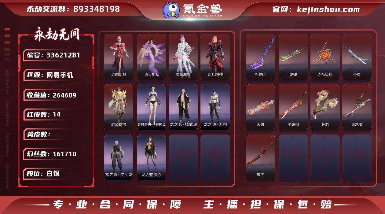WJ6184,网易手机,可换绑,14红410金,等级295,收藏值264609,三人段位白银1,幻丝161710,金砖20,通行证Lv.1,声望2,绿野守竹韵悠,剪纸彩刀,红色神品,监兵凶神,通天狐袄,星辉魔纱,流金晓锦,赤皓新囍,天罚,赤帝炎轮,龙雀,狼主,少阳剑,狂龙,凤求凰,断昼吟,帝星,角色金色皮肤,P5R雨宫莲JOKER,封神录申公豹,禄运玉霄,麟鹿大铠,花之倾奇,倒反阴阳凛冬,瀚海苍鹰,福瑞天泽,英雄袍,冬无归,炽火照夜,春不敛,赤阳天狐,梨园传奇丽娘,秋藏桂,P5R奥村春NOIR,街头狂欢涂鸦少女,武道无穷咏春,卷王,沙海之鸠,倒反阴阳玄影,长歌诗韵念奴娇,寿竹云春,怦然心动热力节拍,夏日派对半夏晚风,正法袍,虹猫蓝兔七侠传虹猫,金财聚辉,孤影戎装,云间影,赤焰战灵,天虹咏,开辟鸿蒙日月明,暖冬茶馨,雪铃绮歌,龙之道灵心,虹猫蓝兔七侠传蓝兔,长歌诗韵如梦令,觉明尊者,冬日绮韵白熊,新魔杰伏龙尊者,若水尊者,九州遗珍福寿仙,甜夜安眠鹅黄纱梦,怪诞狂想红蓝狂想,承武昆仑,倒反阴阳炽羽,康复之星,不良人李星云,长歌诗韵鹧鸪天,巫师3杰洛特,瑞火麟,龙之影精武魂,观山海相柳,红川仙子,碧水青天,洛天依星空投影,巅峰极速小可,御宅...