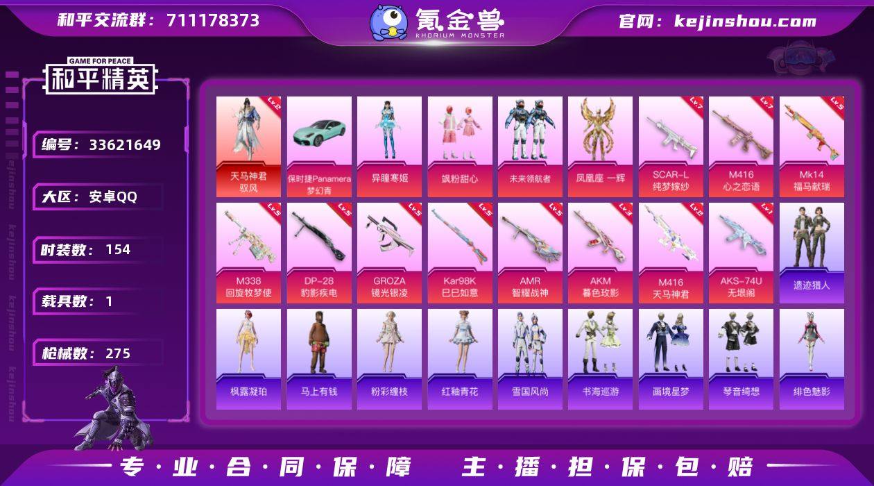 【kyhp1807】安卓 手Q-1神装-4粉装-11特效枪-1载具-9粉色飞行器-83260热力值-20王牌印记-154套装-275枪皮 【红色神装等级】:天马神君-驭风(二级) 【红色角色神装】:天马神君-驭风 【热门品类】:角色-军刀雅典娜,套装-龟仙人,角色-Mark.06 【粉色套装】:粉装-飒粉甜心,粉装-未来领航者,角色-凤凰座 一辉,角色-异瞳寒姬 【粉色枪皮等级】:AKM-暮色玫影(三级),SCAR-L-纯梦嫁纱(七级),M416-心之恋语(七级),M416-天马神君(二级),GROZA-镜光银凌(五级),AKS-74U-无垠阁(一级),Kar98K-巳巳如意(五级),Mk14-福马献瑞(五级),AMR-智耀战神(五级),DP-28-豹影疾电(五级),M338-回旋牧梦使(五级) 【粉色载具】:保时捷Panamera(梦幻青) 【粉色枪皮】:AKM-暮色玫影,SCAR-L-纯梦嫁纱,M416-心之恋语,M416-天马神君,GROZA-镜光银凌,AKS-74U-无垠阁,Kar98K-巳巳如意,Mk14-福马献瑞,AMR-智耀战神,DP-28-豹影疾电,M338-回旋牧梦使 【粉色飞行器】:香车宝马飞行器,炫彩糖果飞行器,祥瑞起舞飞行器,沙丘之主天马,电糖天使飞行器,曦光华影飞行器,暮色之舞飞行器,踏卷乘风飞行器,云梦轻舟飞行器 【粉色降落伞】:守护天翼降落伞,初号机 觉醒Ver.降落伞,临安...